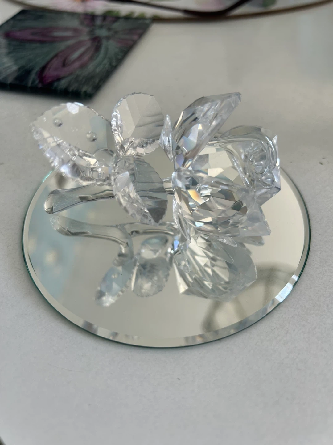 Beautiful crystal rose figurine. Crafted from clear glass with intricate detailing on the petals and leaves. It's a lovely decorative piece for any shelf or table.