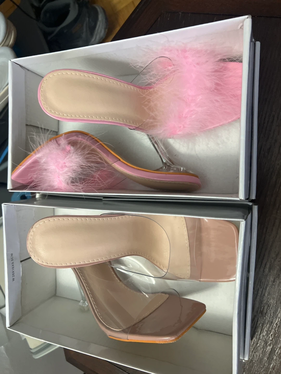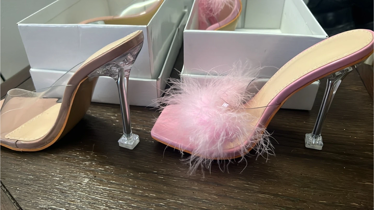 Two pairs of stylish square-toe mules included. One pair features a fluffy pink feather trim, and the other has a clear strap design. Both have clear block heels and come in their original boxes. ($25 both.)