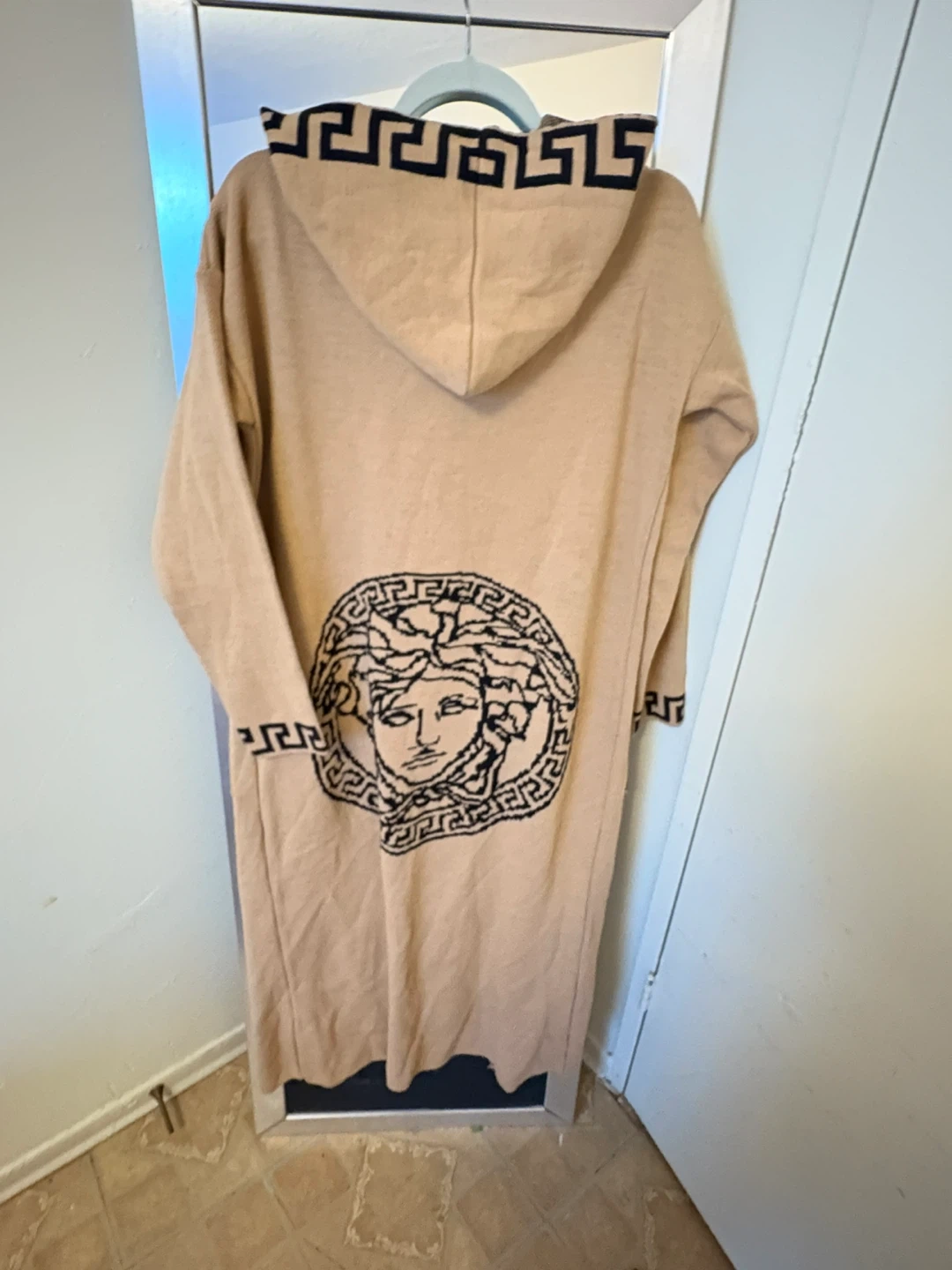 This long knit cardigan features a camel colour with a black Greek key trim and a large Medusa head print on the back. It has an attached hood and front pockets. It's a cozy layering piece.