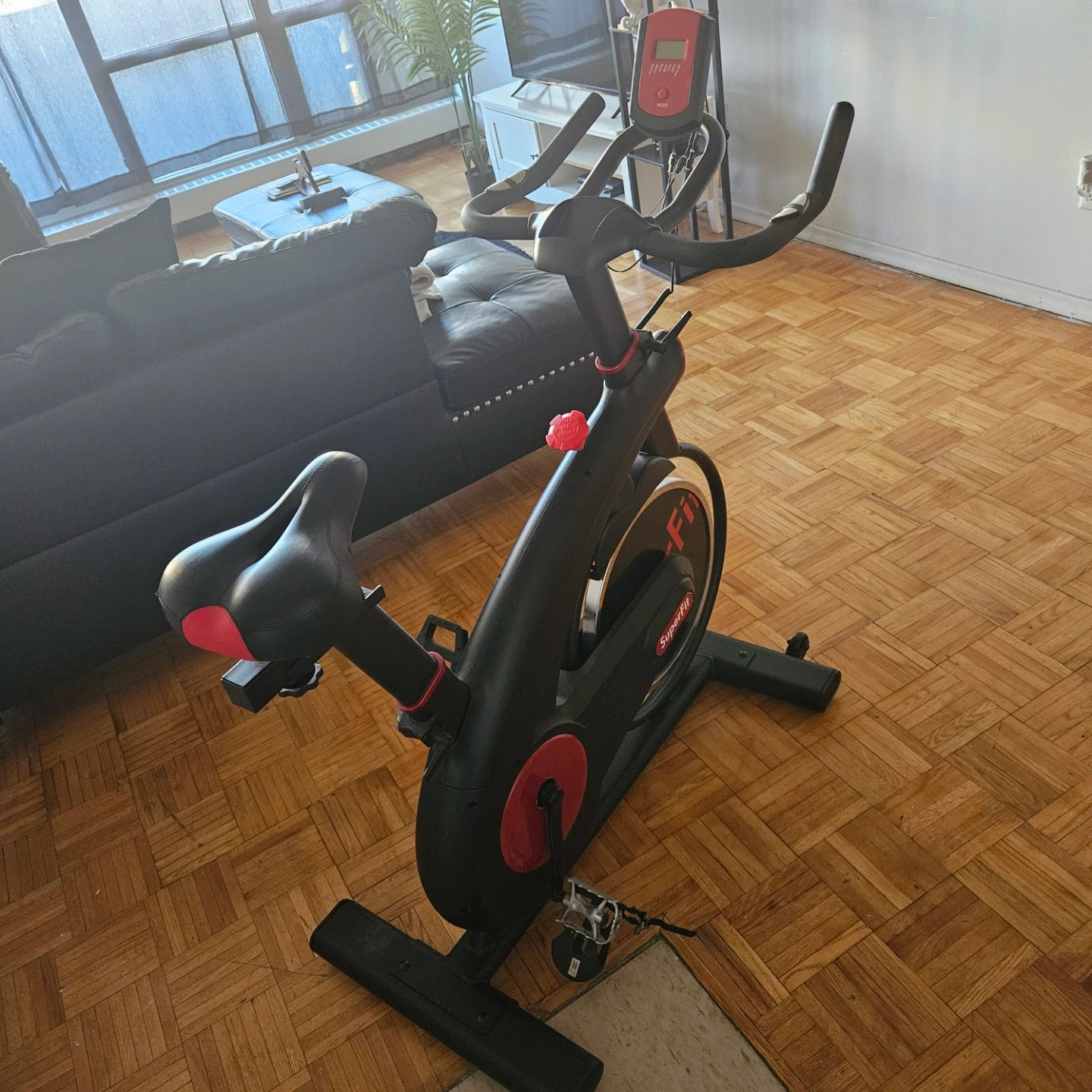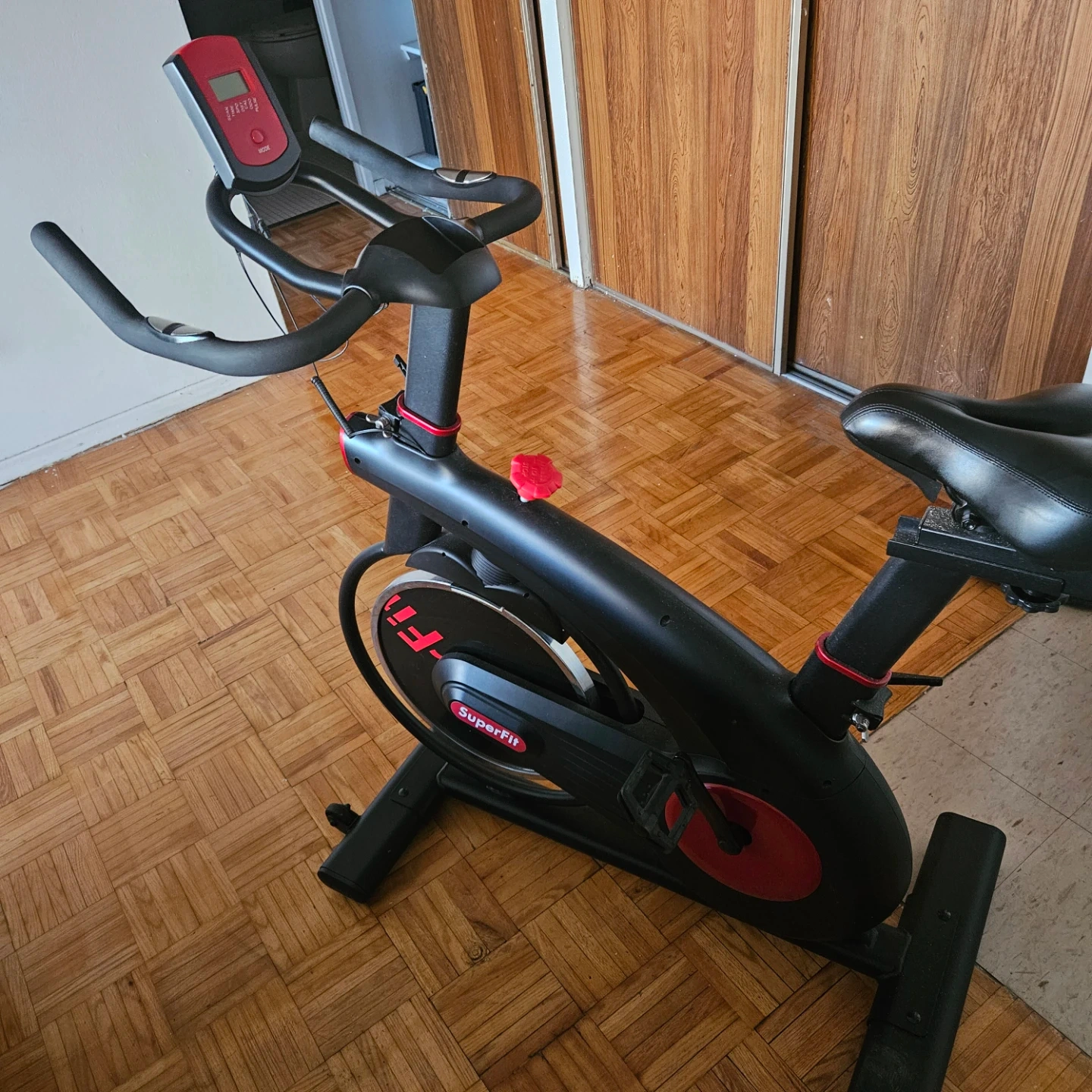 This is a SuperFit spin bike for home workouts. It's black with red accents and has an adjustable seat and handlebars. The console displays workout data.