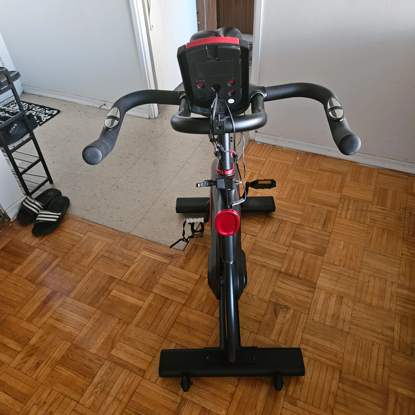 This is a SuperFit spin bike for home workouts. It's black with red accents and has an adjustable seat and handlebars. The console displays workout data.