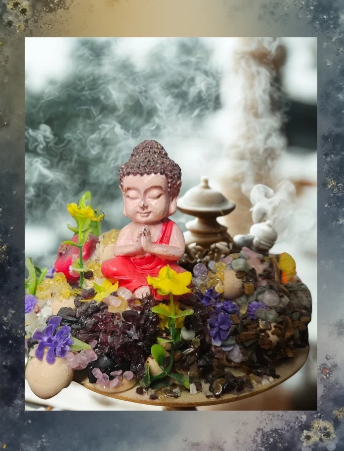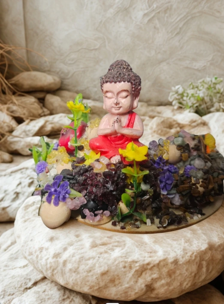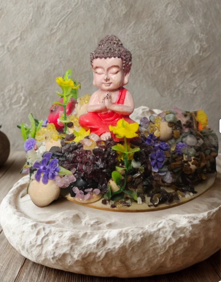 Magnifique petite figurine de Bouddha en position de prière, entourée de fausses pierres et de fleurs colorées. Parfait pour ajouter une touche zen à votre décor intérieur. Ses dimensions sont idéales pour une étagère ou un bureau.