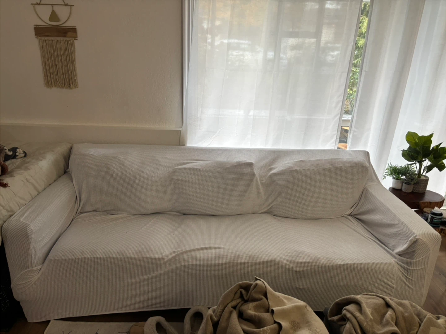 This stretch sofa slipcover is designed for furniture protection. It's made with spandex jacquard fabric for a snug fit. Elastic bottom ensures it stays in place, making it suitable for homes with pets or kids.