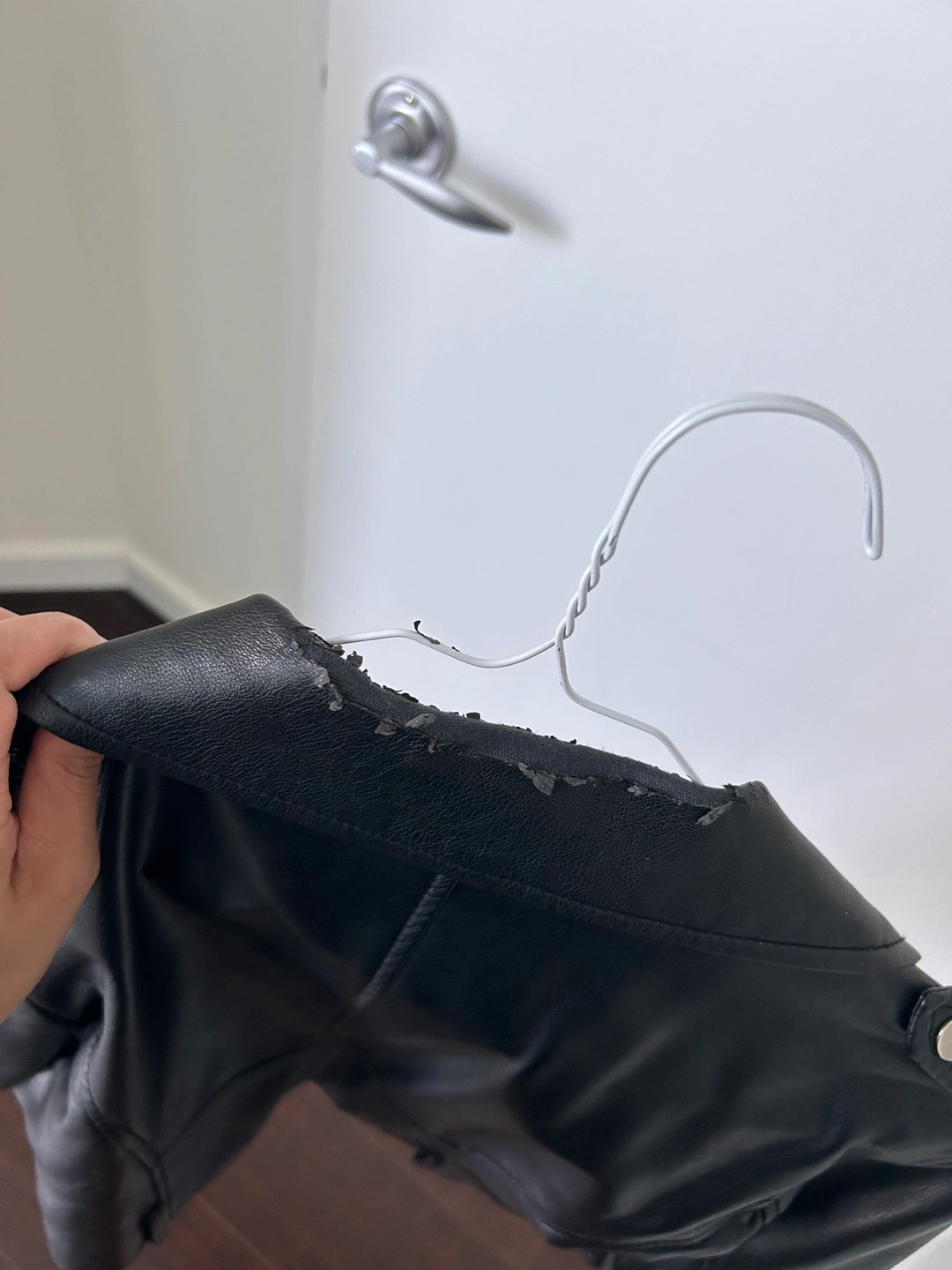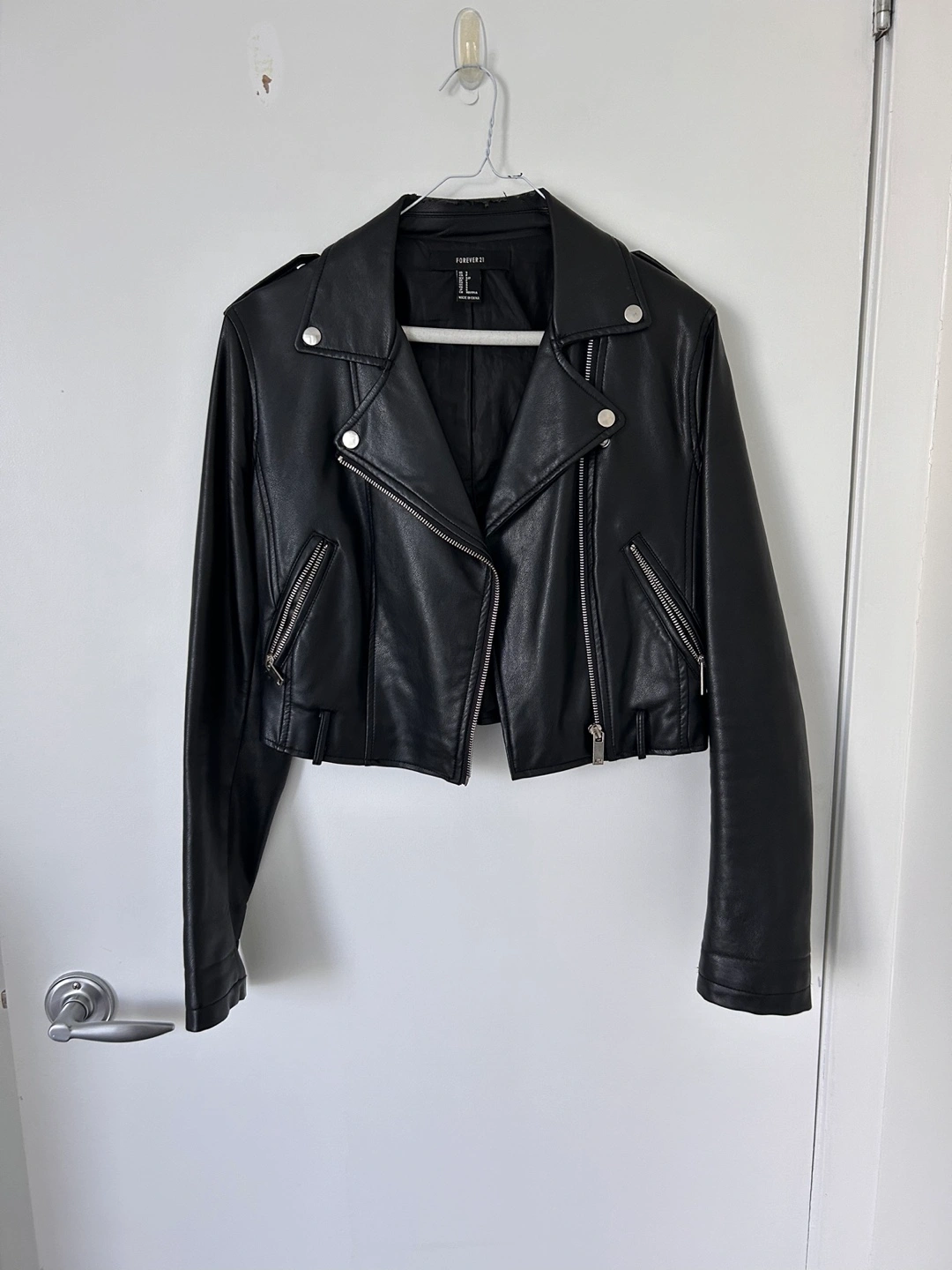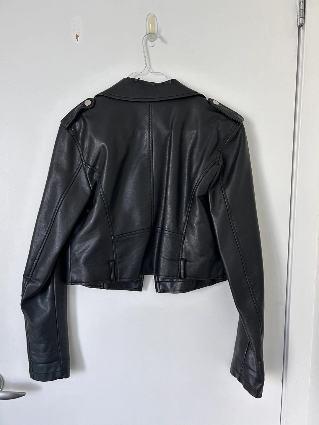 Black faux leather jacket with zipper closure and pockets. Has some wear and tear on the collar, as seen in the photos.