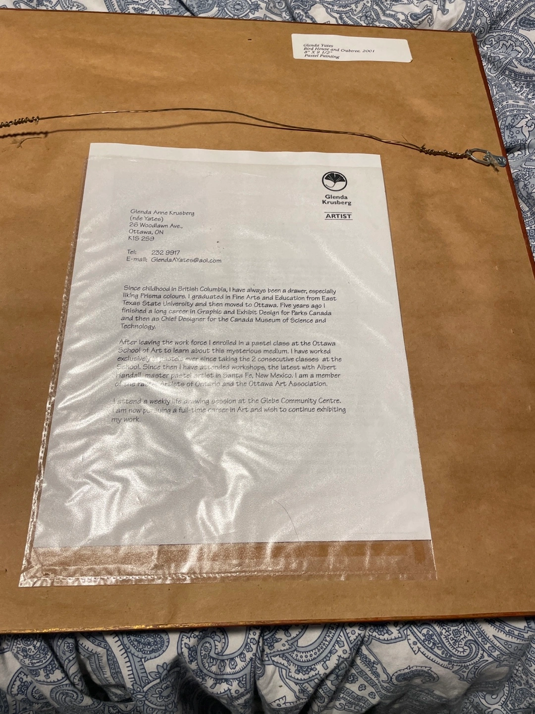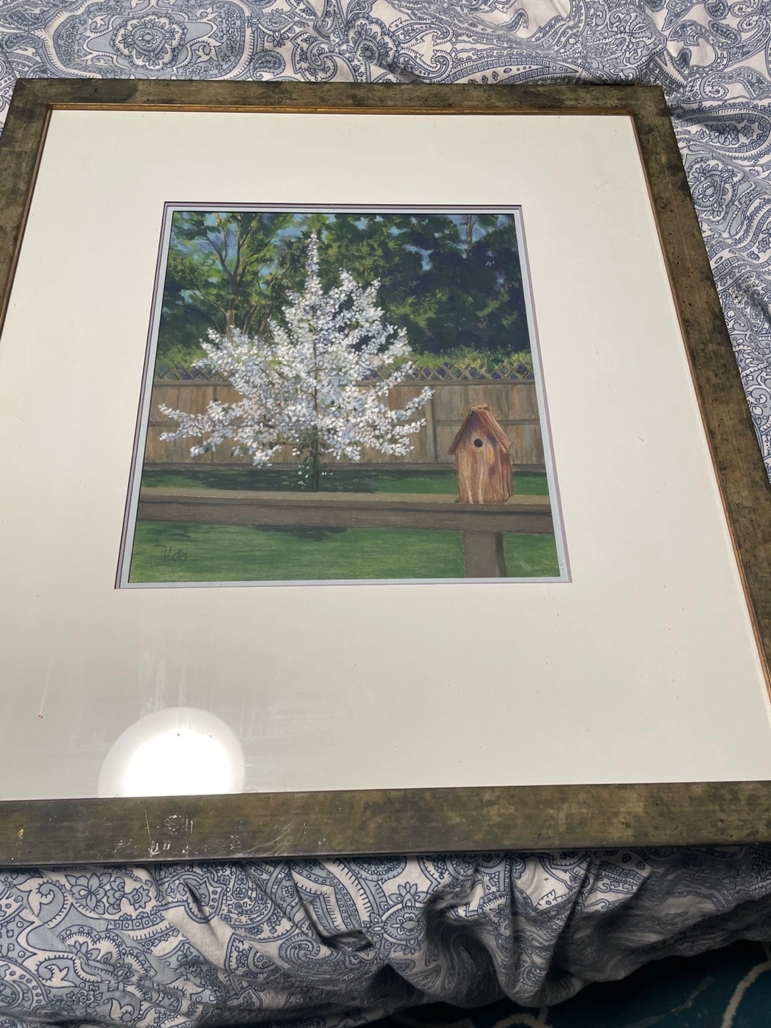 10Original pastel artwork, framed. Depicts a flowering tree and a birdhouse on a fence. Artist's signature visible. Comes with a letter from the artist.