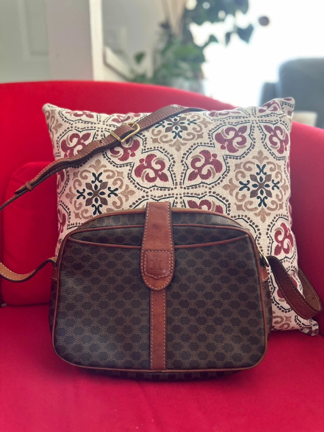 Celine crossbody bag. Brown leather and canvas. Adjustable strap. Classic design.