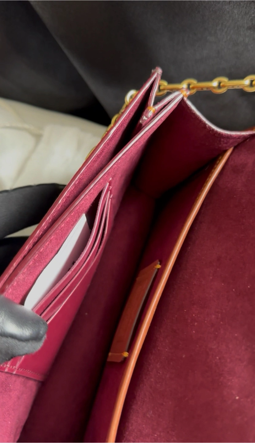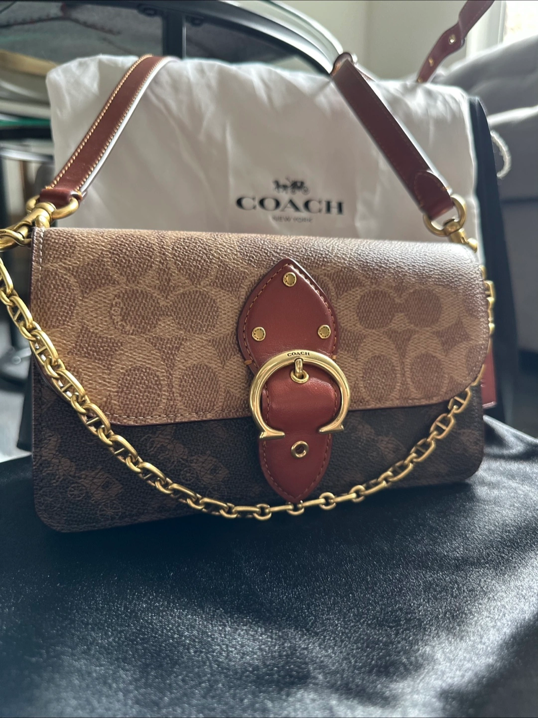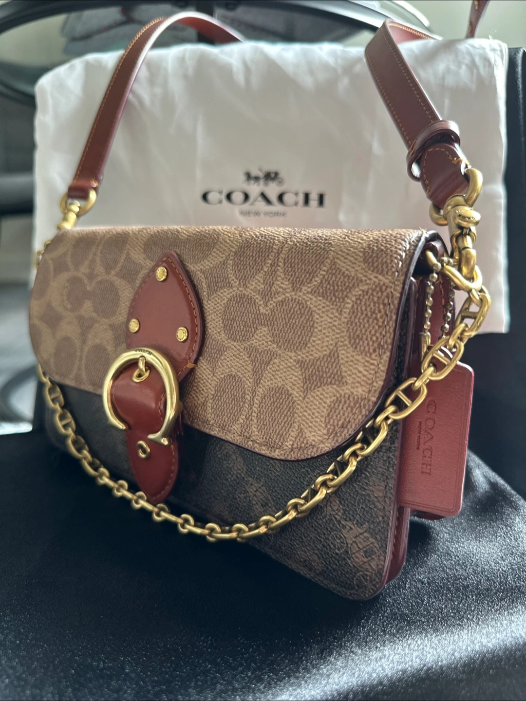 Store bought. Brown and beige Coach wallet on chain. Features a unique buckle closure and gold chain strap. Burgundy interior. Multiple card slots. Excellent Condition.