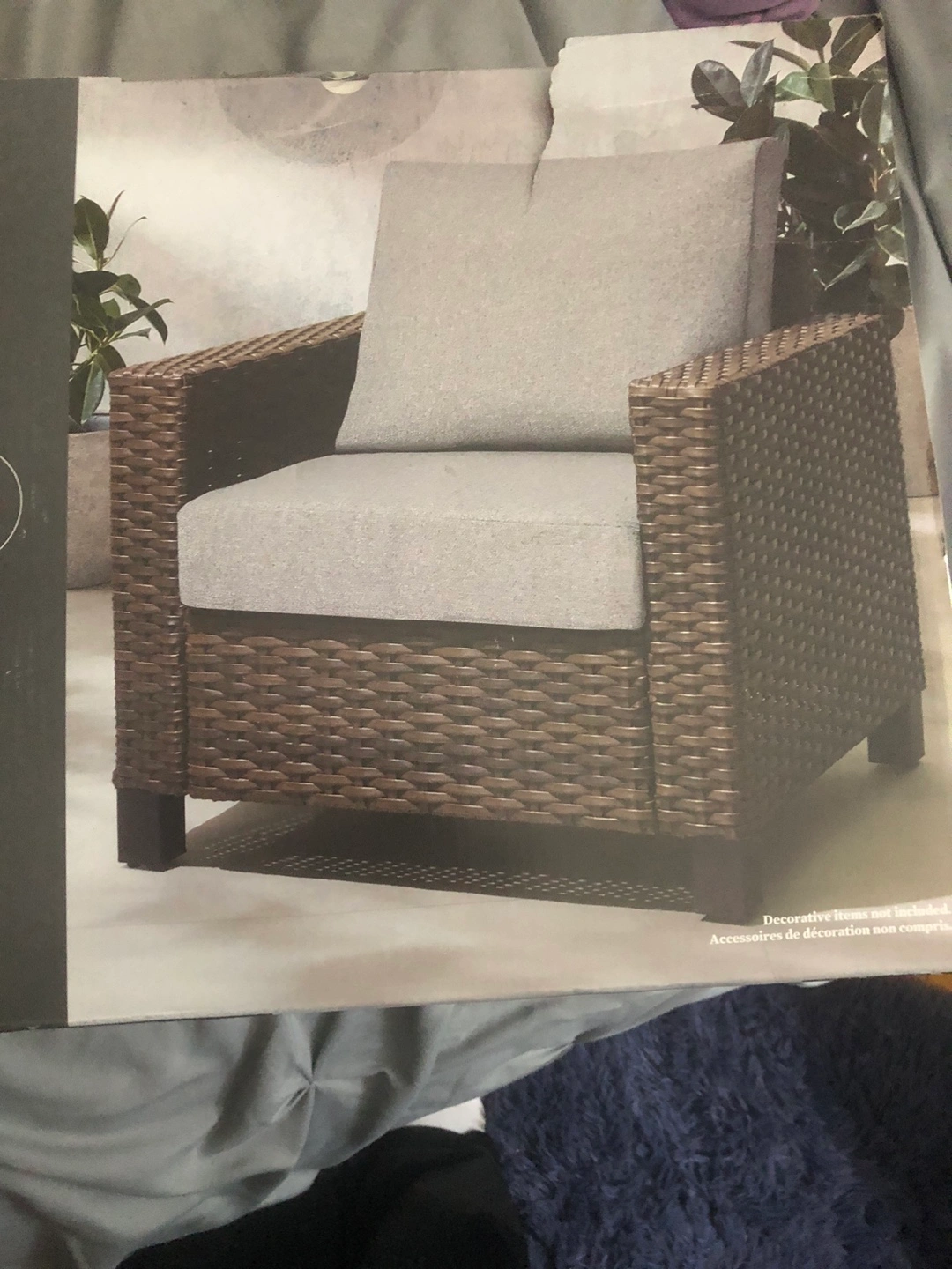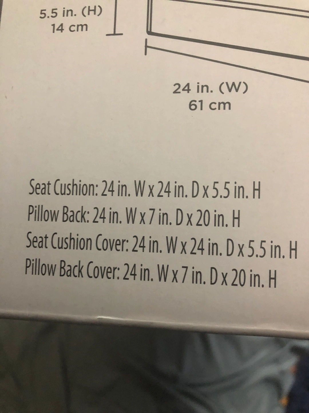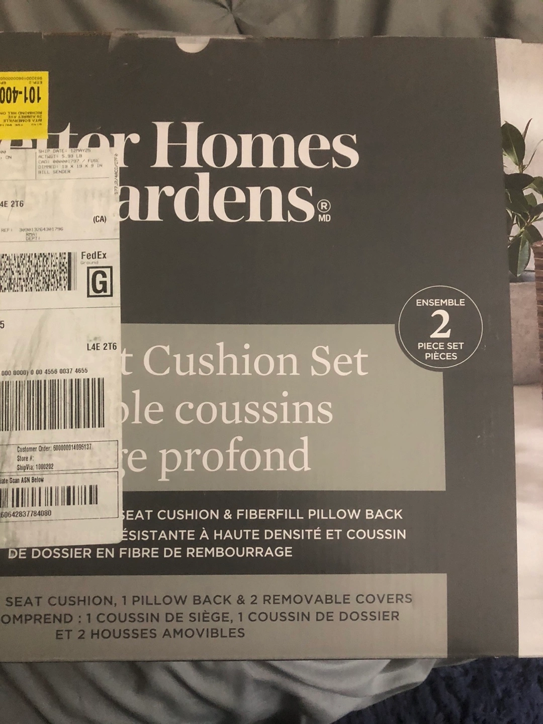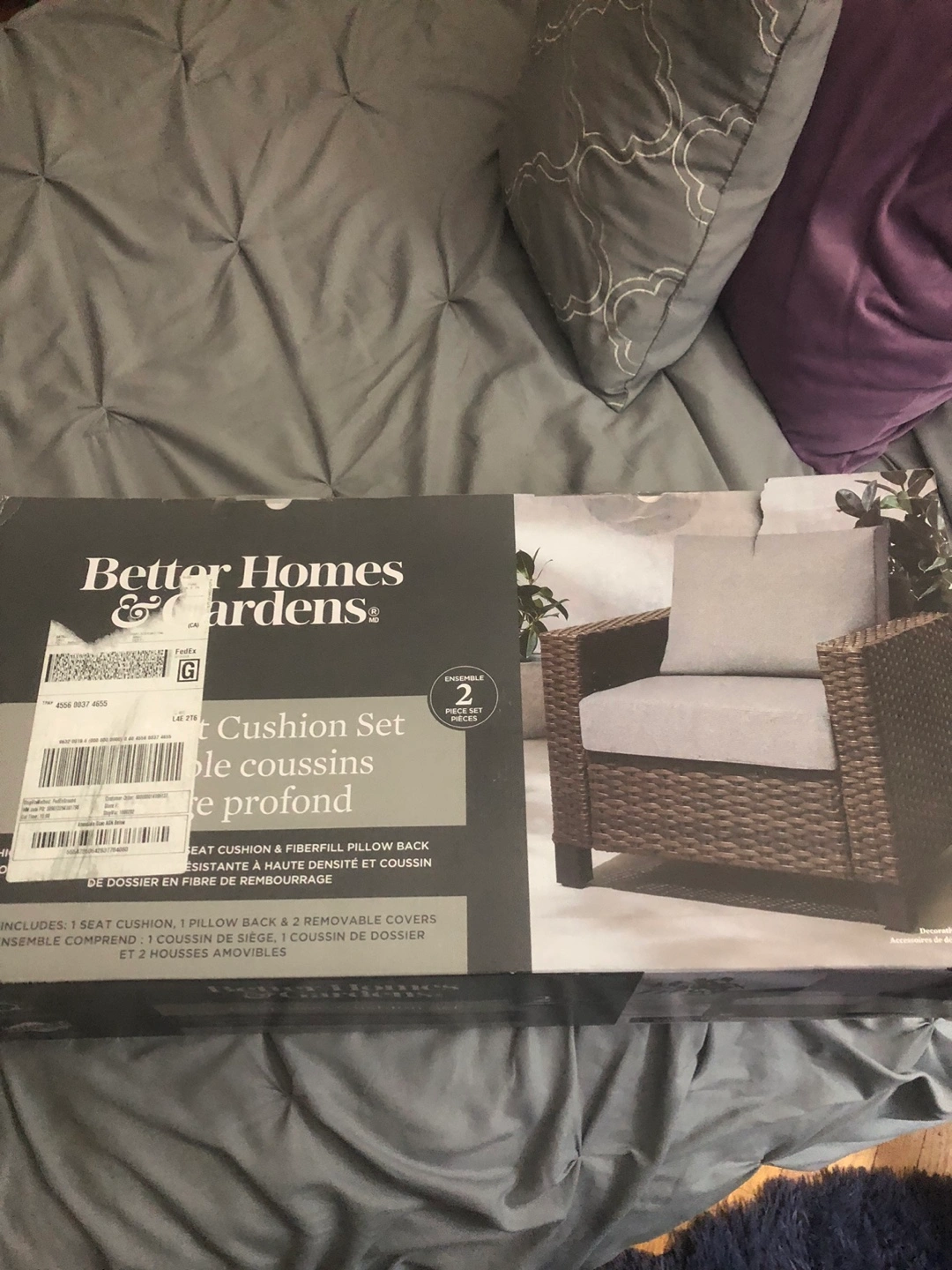 71New in box Better Homes & Gardens outdoor cushion set. Two-piece set includes seat cushion and pillow back. Grey cushions, removable covers. High-density fibrefill. See picture for dimensions. Paid $70 - does not fit my current chair.