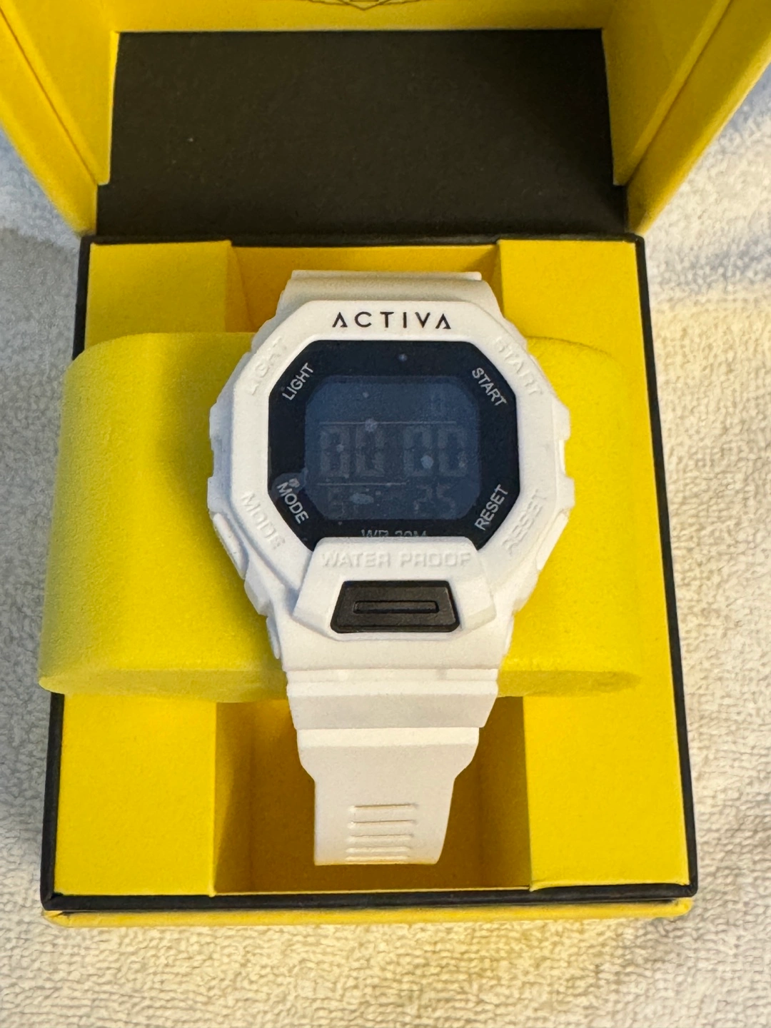- White digital face and band.