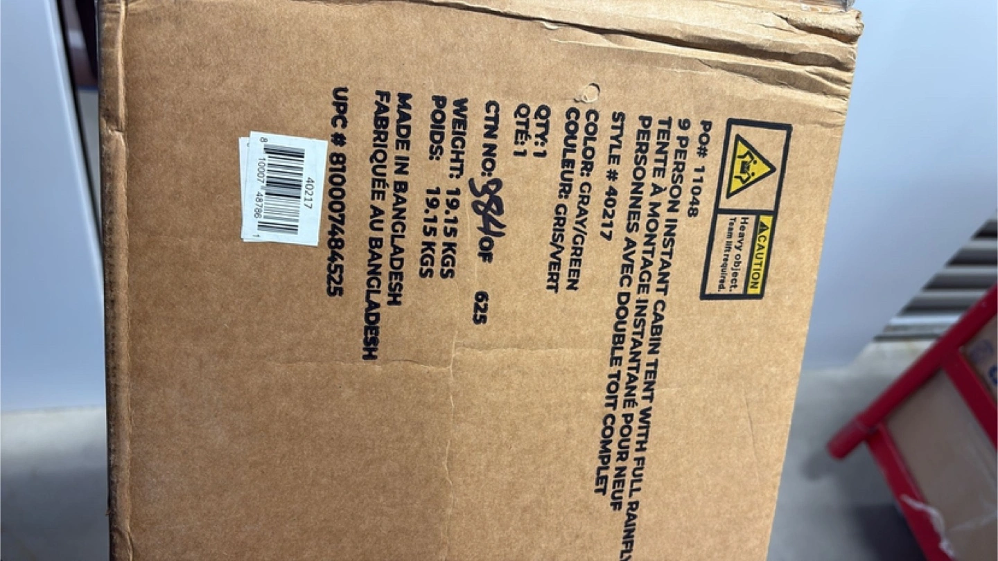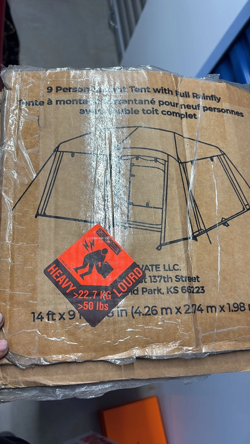 Brand new in box. 9-person instant cabin tent. Full rainfly. Grey/Green. Measures 14ft x 9ft x 6ft.