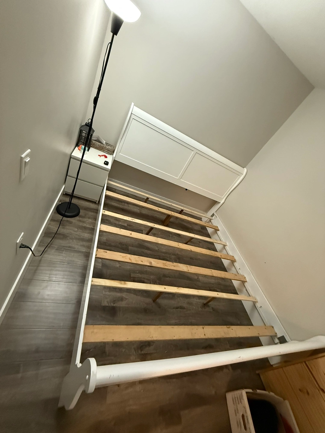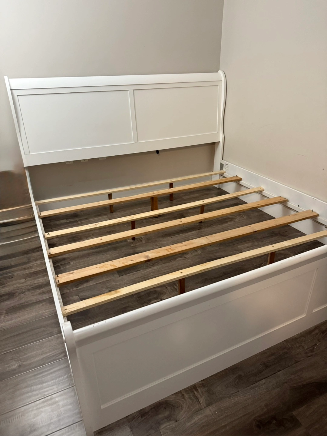 Queen size sleigh bed frame, white finish. Includes headboard and footboard. Solid wood construction. No mattress or box spring included. Simple assembly required.