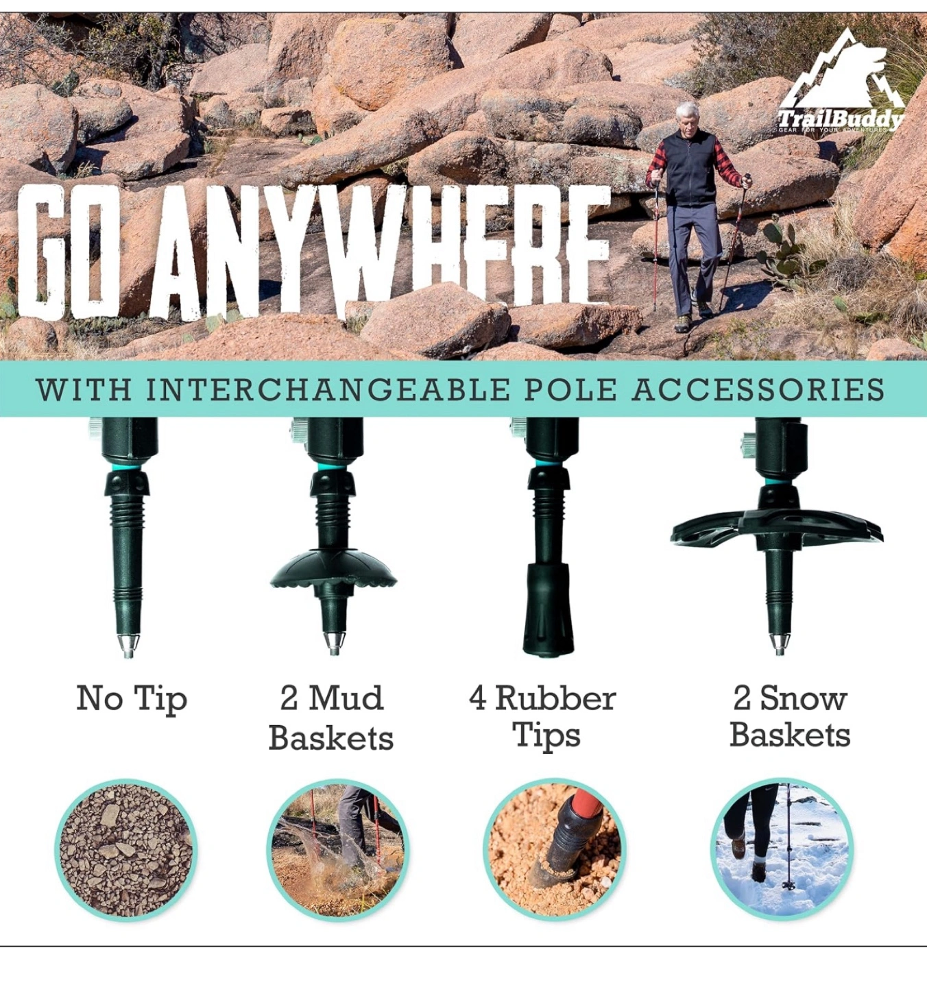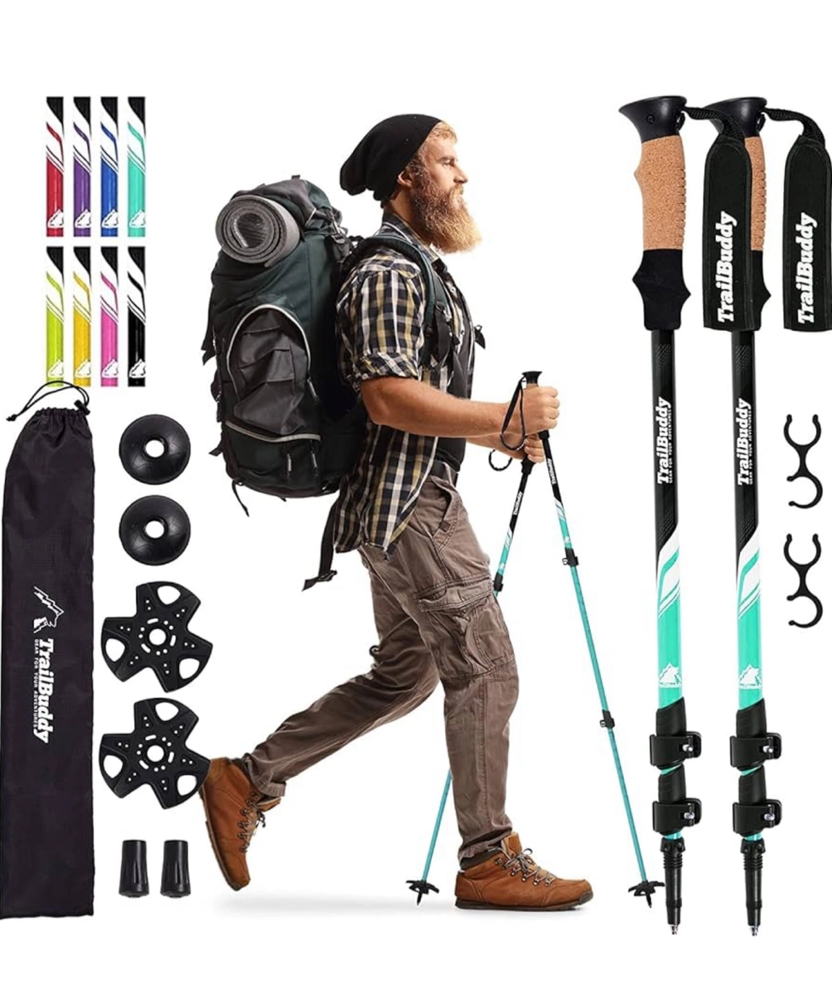 Pair of adjustable TrailBuddy trekking poles. Features lever locks, cork grips, moisture-wicking handles, and padded straps. Includes multiple interchangeable accessories for various terrains: mud baskets, rubber tips, and snow baskets. Aircraft-grade 7075 aluminum construction.