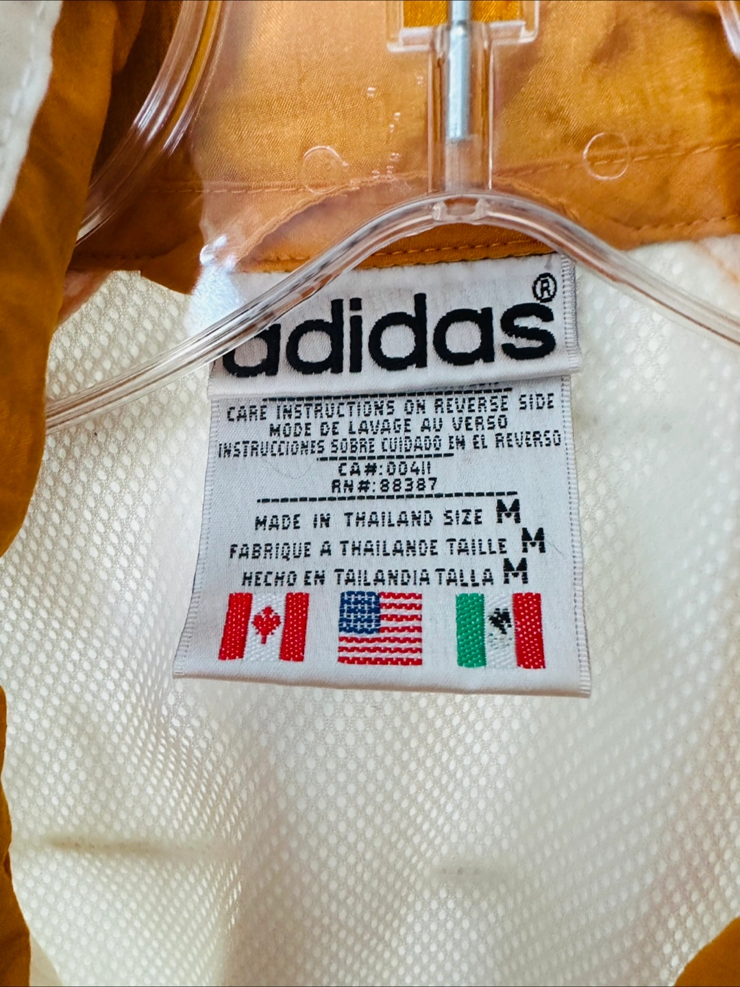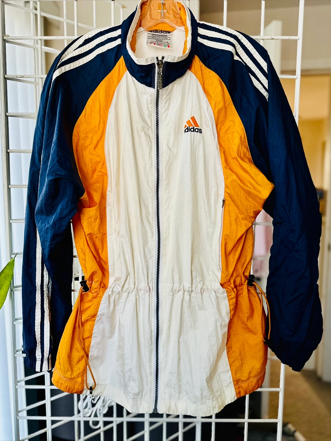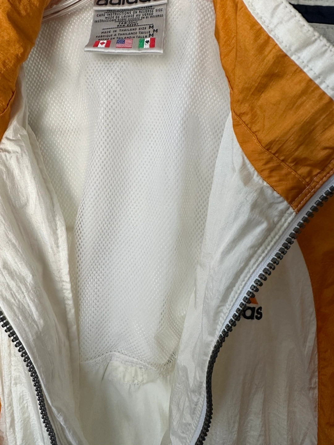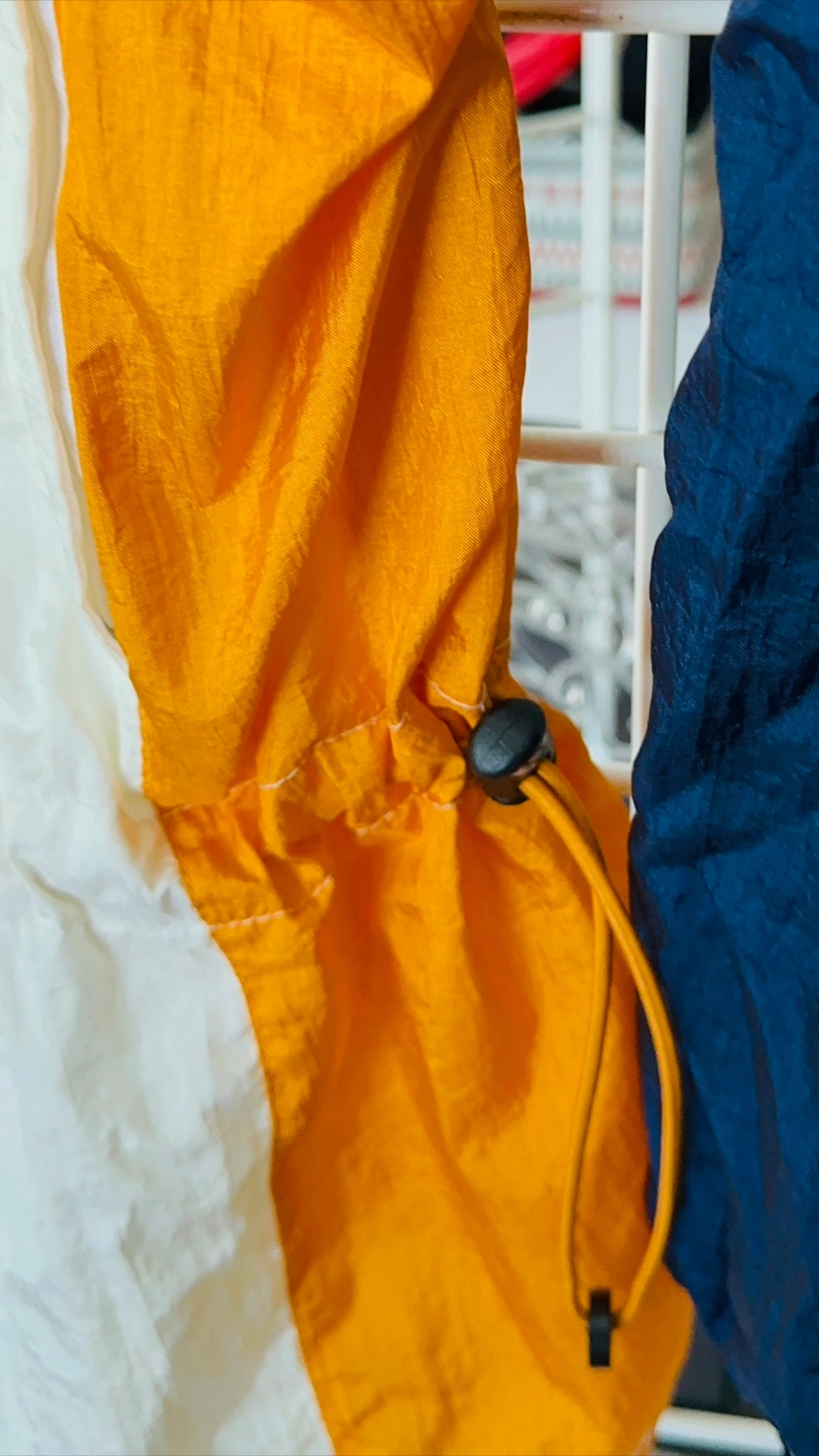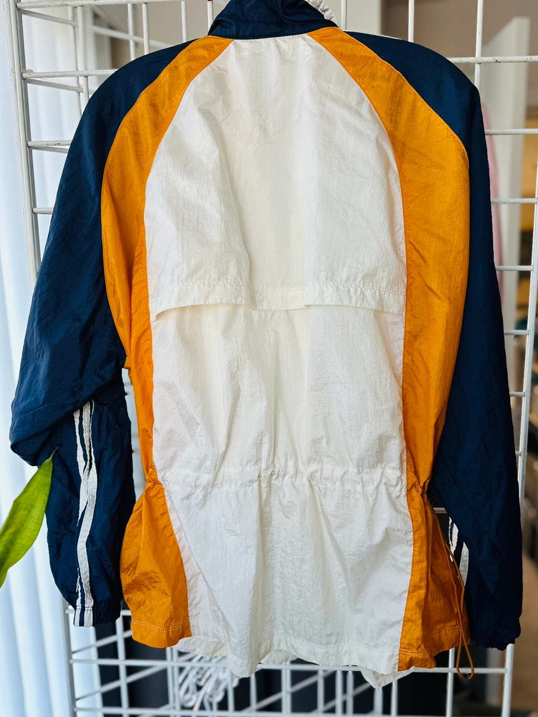 Lightweight windbreaker. Three colour block design. White, navy blue, and mustard yellow. Drawstrings at waist. Zip closure. Mesh lining. Made in Thailand.