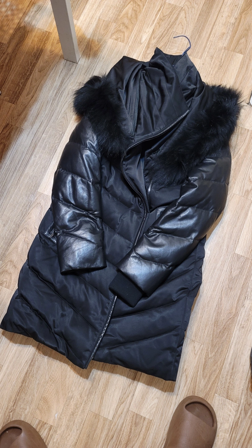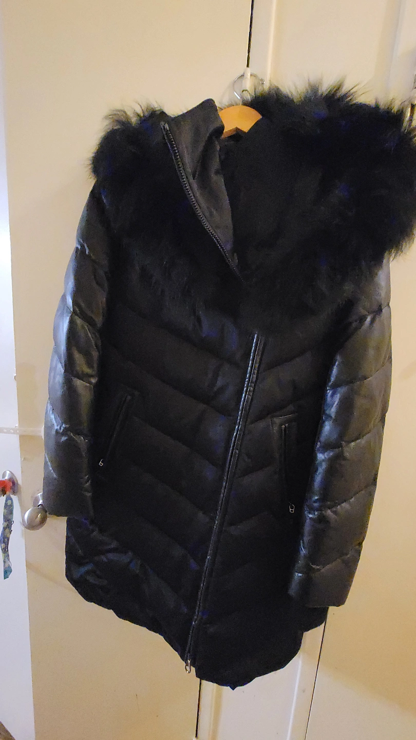 Long black puffer jacket. Features a leather-like exterior, a fur-trimmed hood, and an asymmetrical zipper. Warm and stylish winter coat.