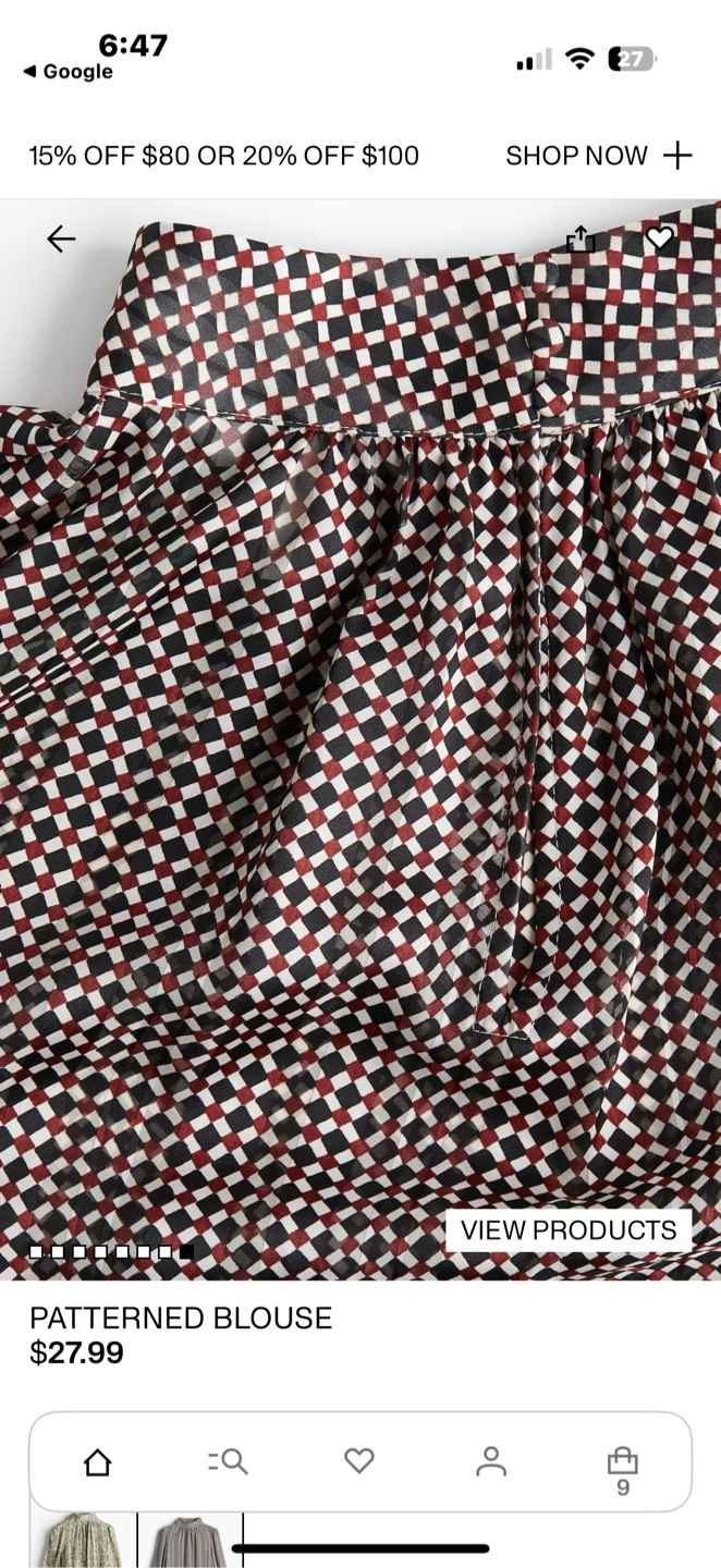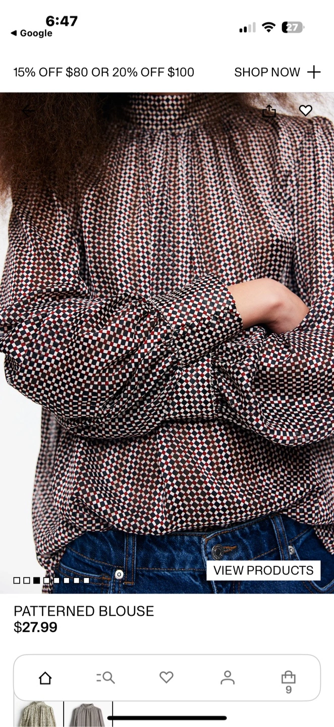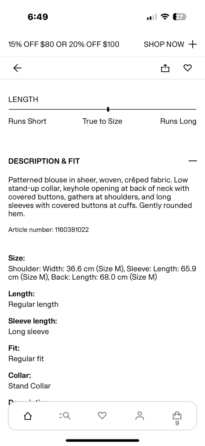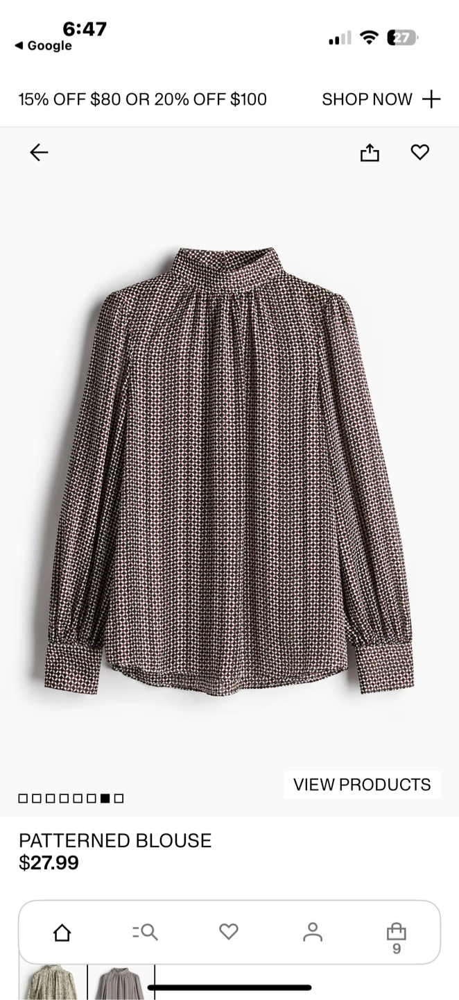 50H&M Long sleeve patterned blouse. Stand-up collar, keyhole opening at back of neck. Covered buttons, gathers at shoulders. Gently rounded hem. Runs true to size.