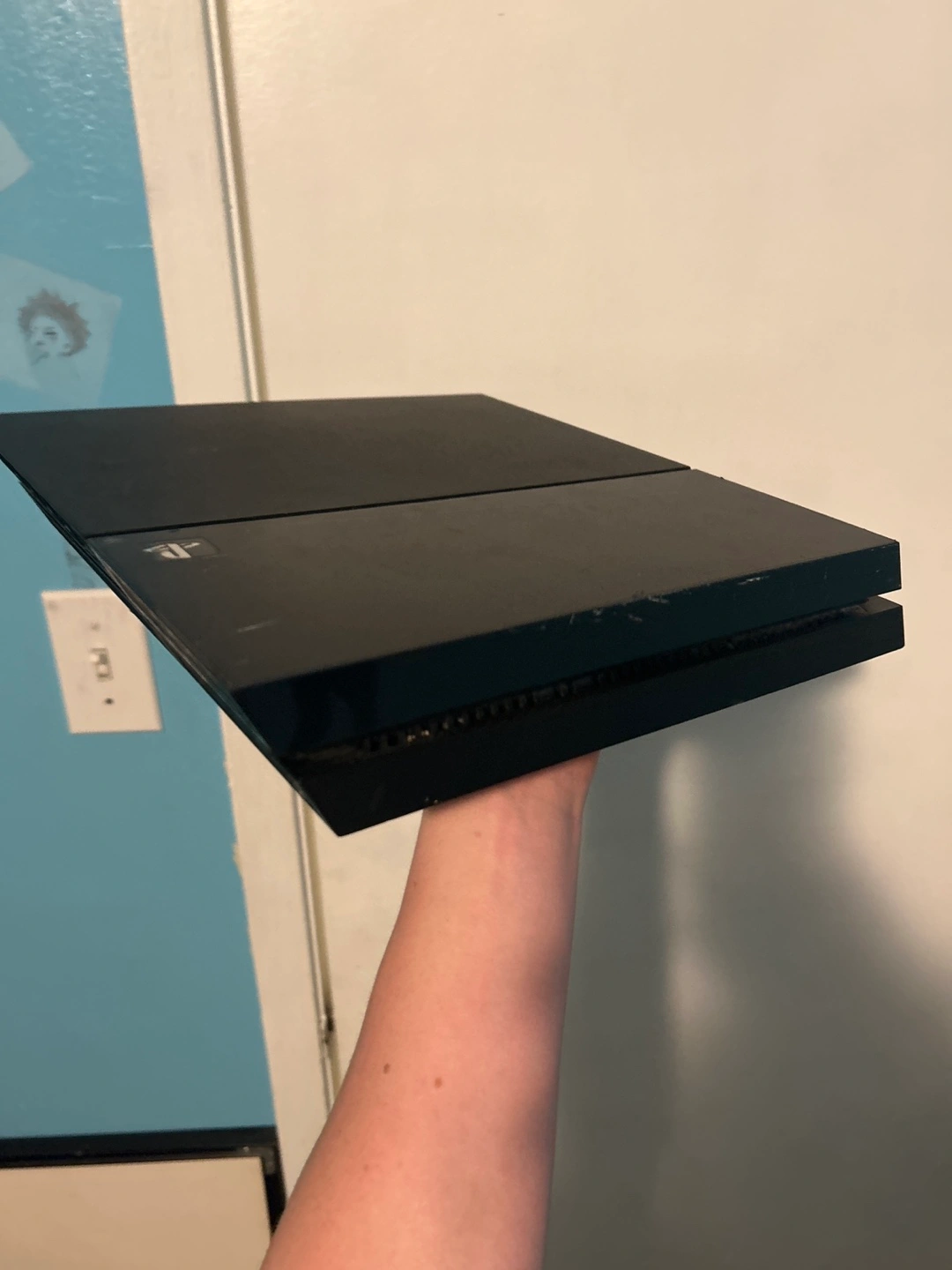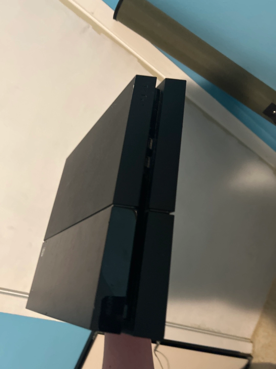 Black PlayStation 4 console. Some scuffs and scratches visible. Includes power and data ports. Sold as-is. Also comes with a remote. Or willing to trade for a digital camera or a lot of mha things or for sealed Pokemon or anime packs want this gone may be able to negotiate a little