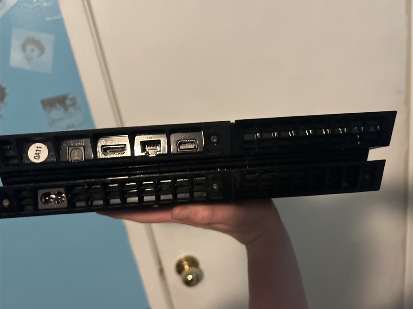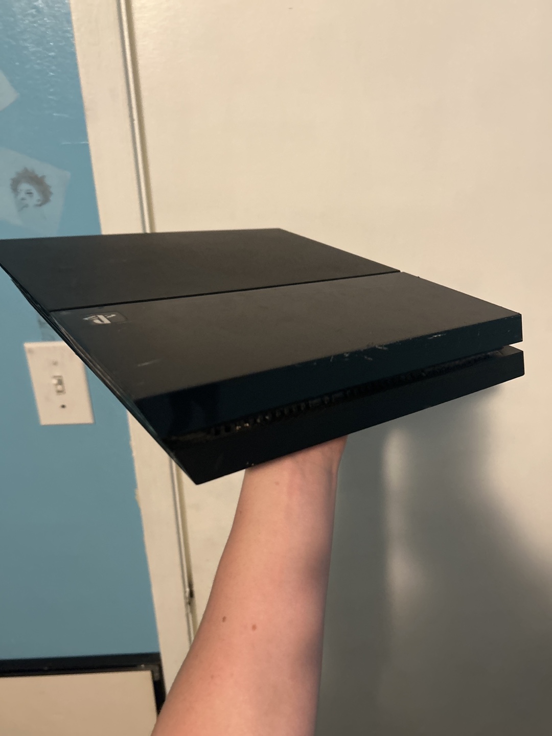 Black PlayStation 4 console. Some scuffs and scratches visible. Includes power and data ports. Sold as-is. Also comes with a remote. Or willing to trade for a digital camera or a lot of mha things or for sealed Pokemon or anime packs want this gone may be able to negotiate a little