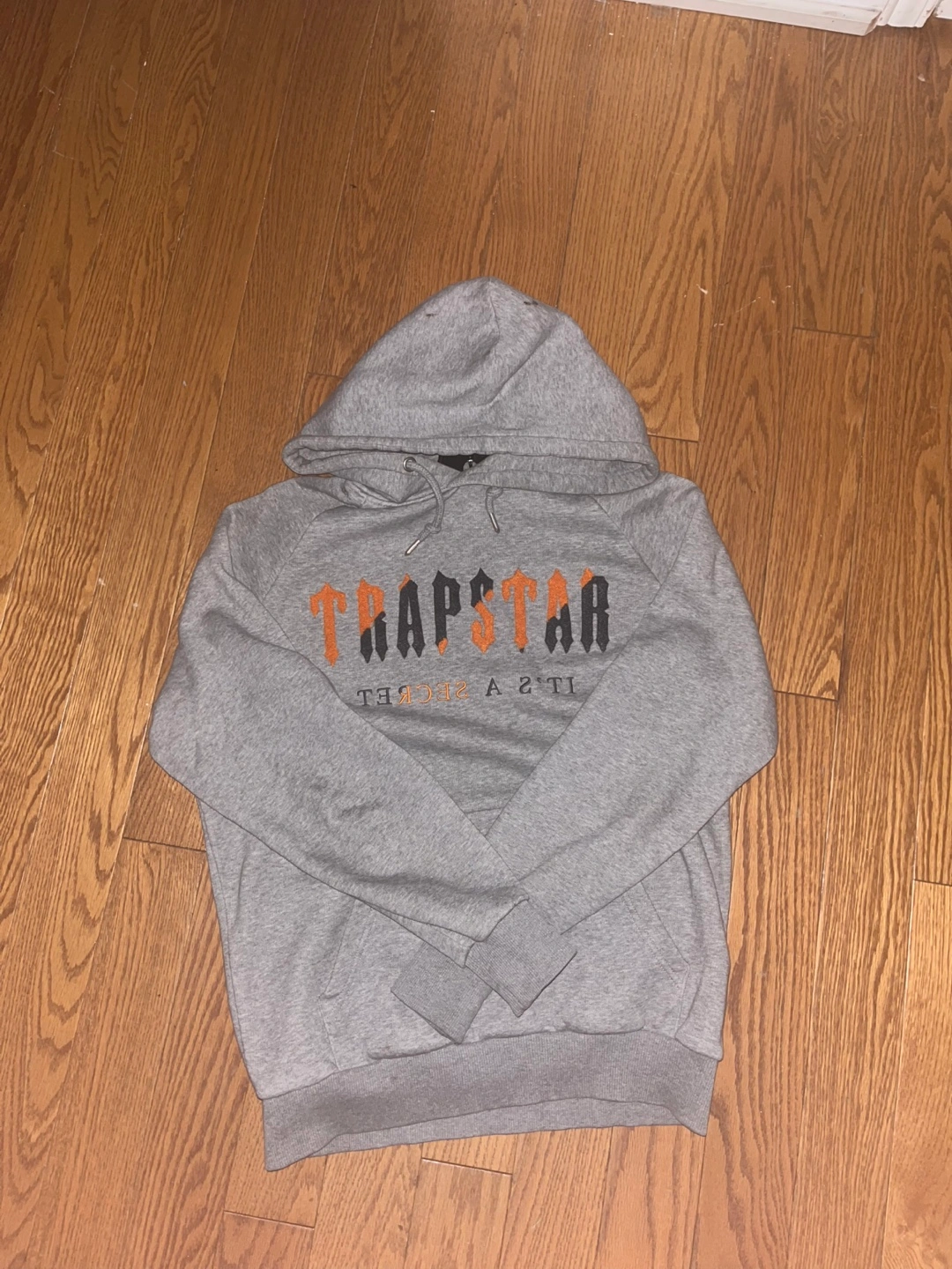 9Grey Trapstar London hoodie. Features orange and black Trapstar logo. Good condition.