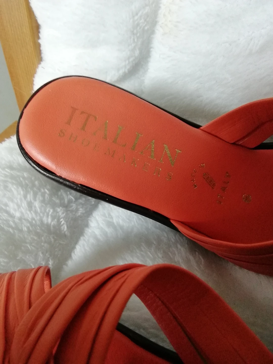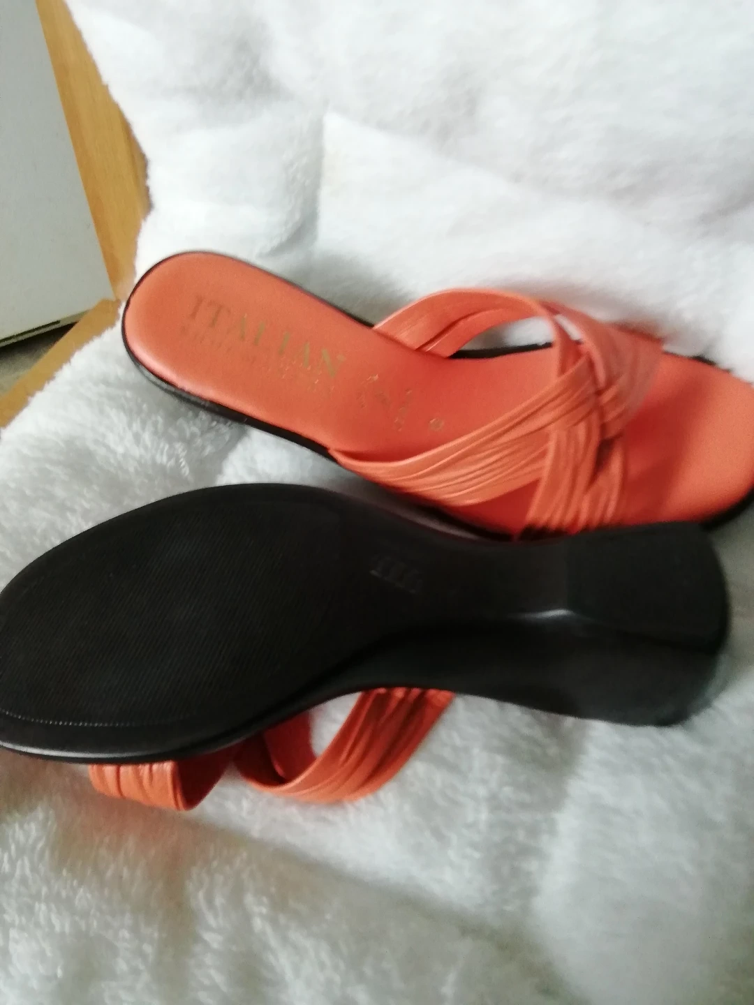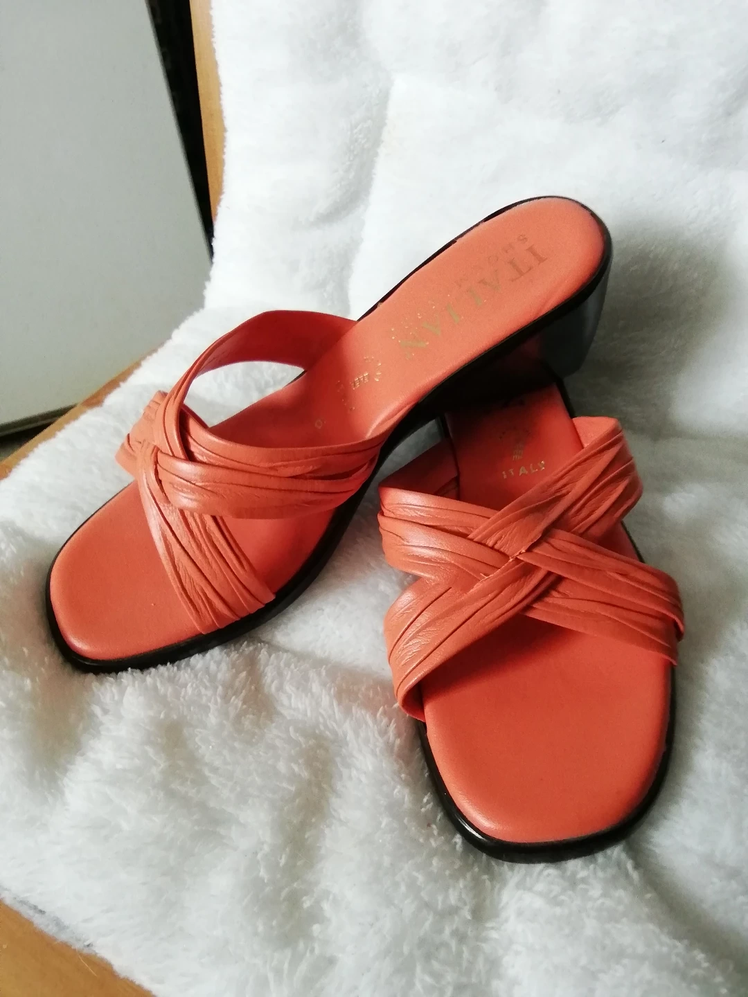 56Women's coral leather sandals. Low wedge heel. Cross-over straps. Size 6 made in ltaly Italian shoemakers brand, bought at Shoe warehouse for$49.99. + taxes, never had a chance to wear it because of medical condition selling for $25 , cash only door pick up only please by 6 pm because I am in a wheelchair, pu ATWOOD STREET OFF PANDORA AVENUE