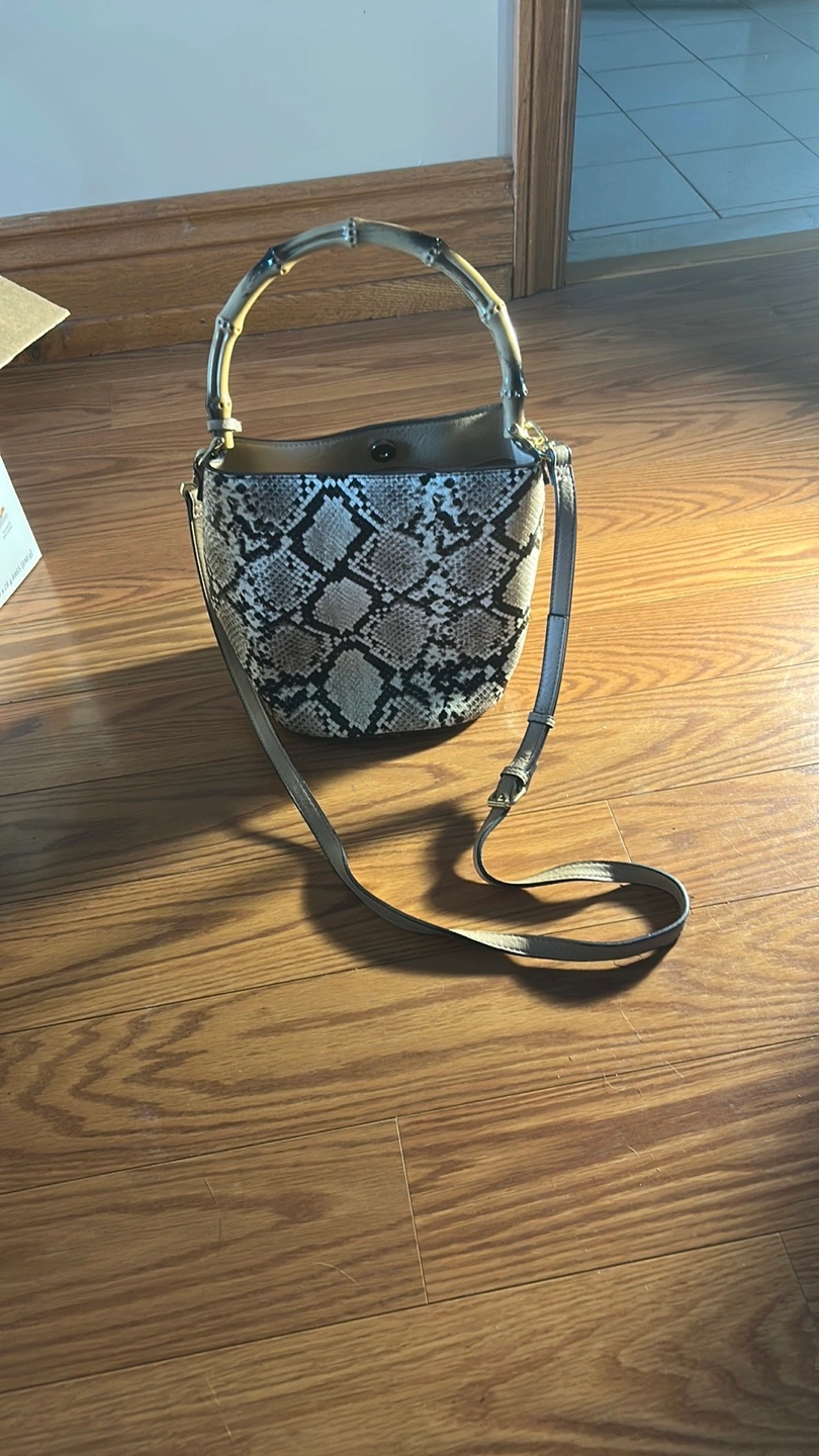 Stylish snakeskin look bucket bag. Features bamboo top handle and adjustable crossbody strap. Beige and brown colour scheme. Excellent condition.