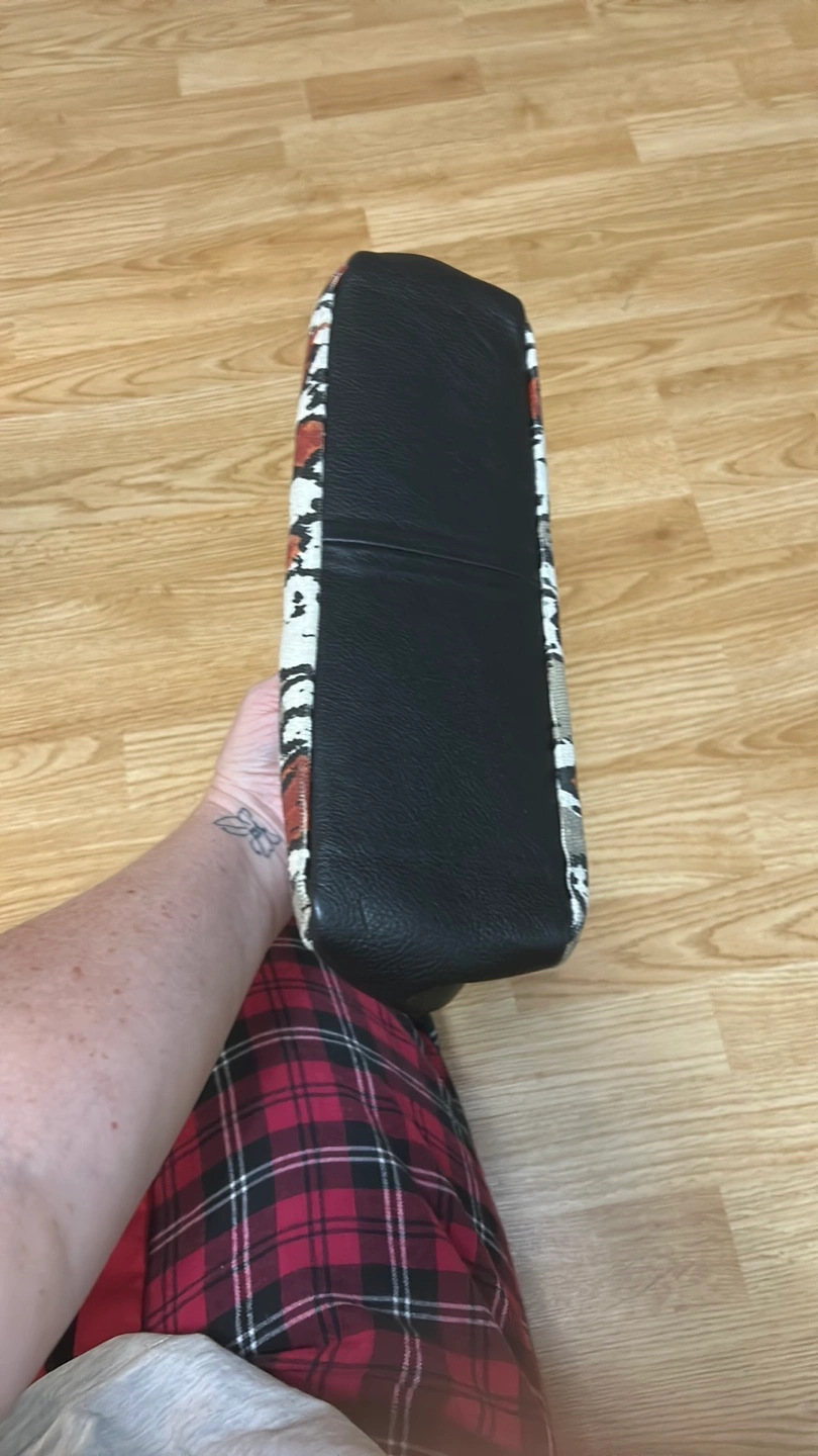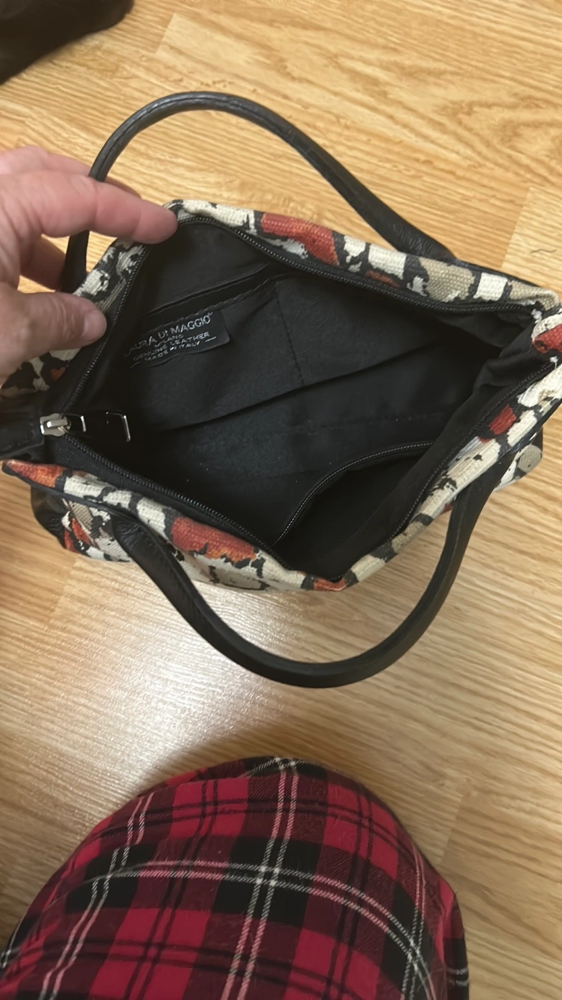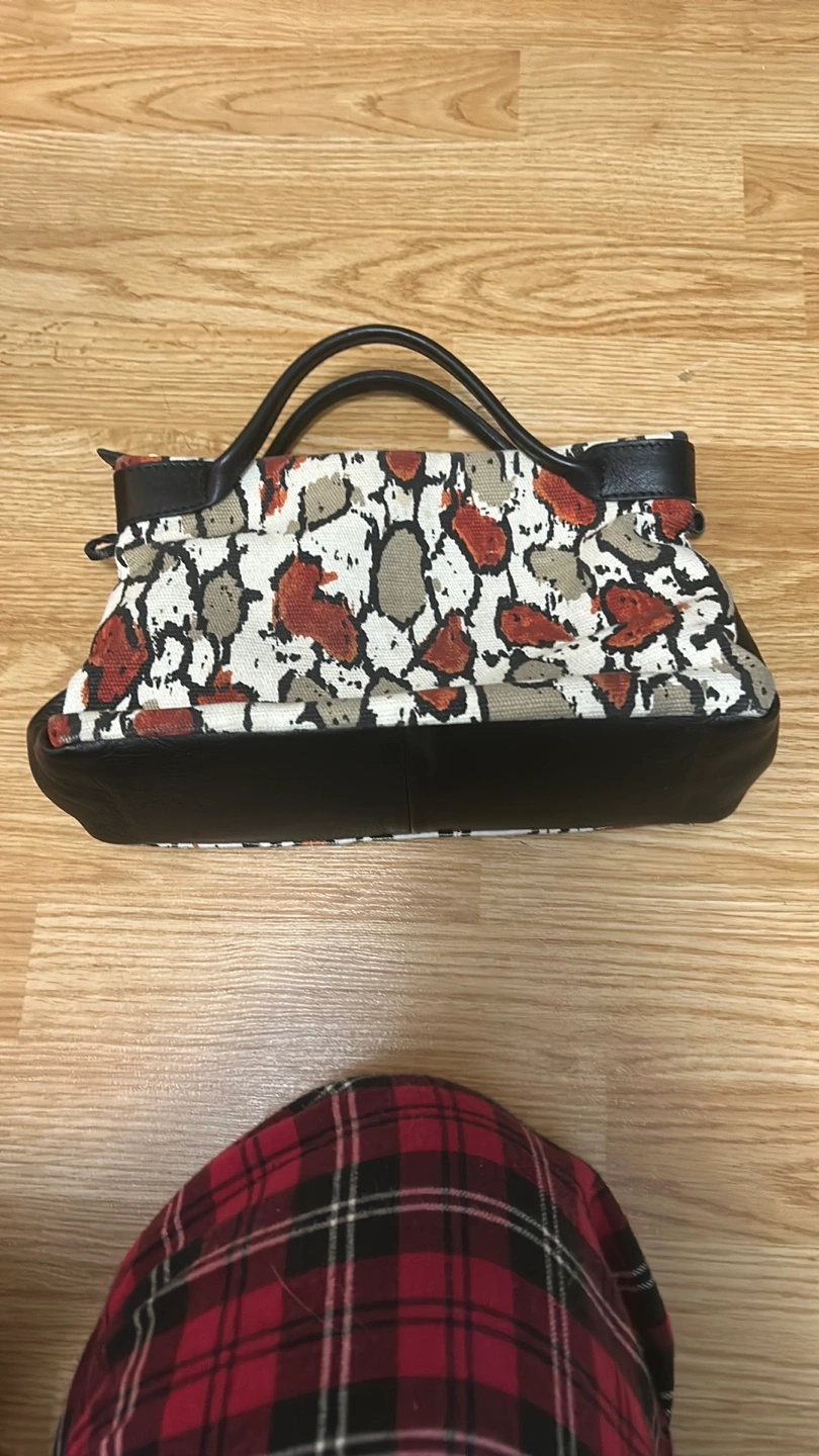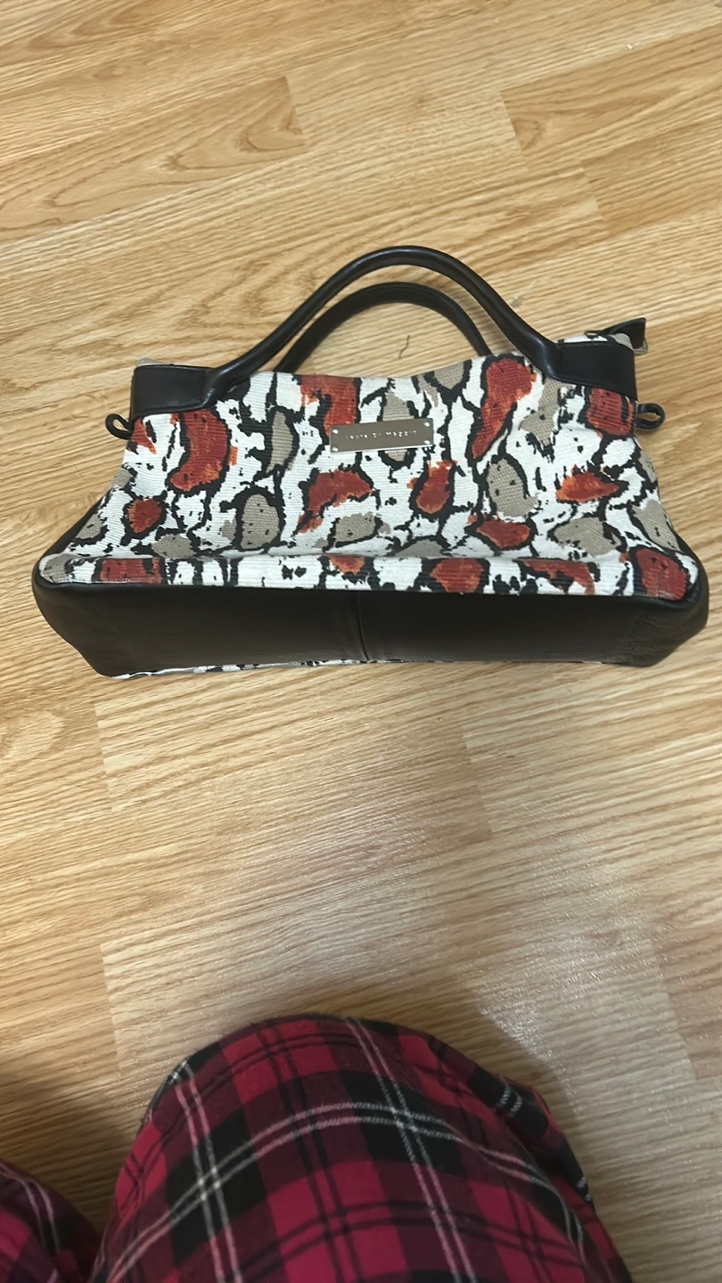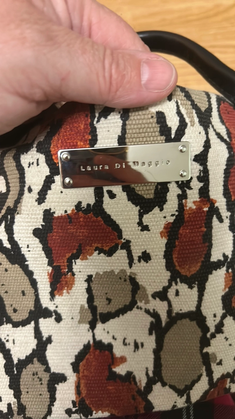 Stylish handbag. Neutral tones. Animal print. Black leather trim. Two handles. Zip closure. Inside pocket.