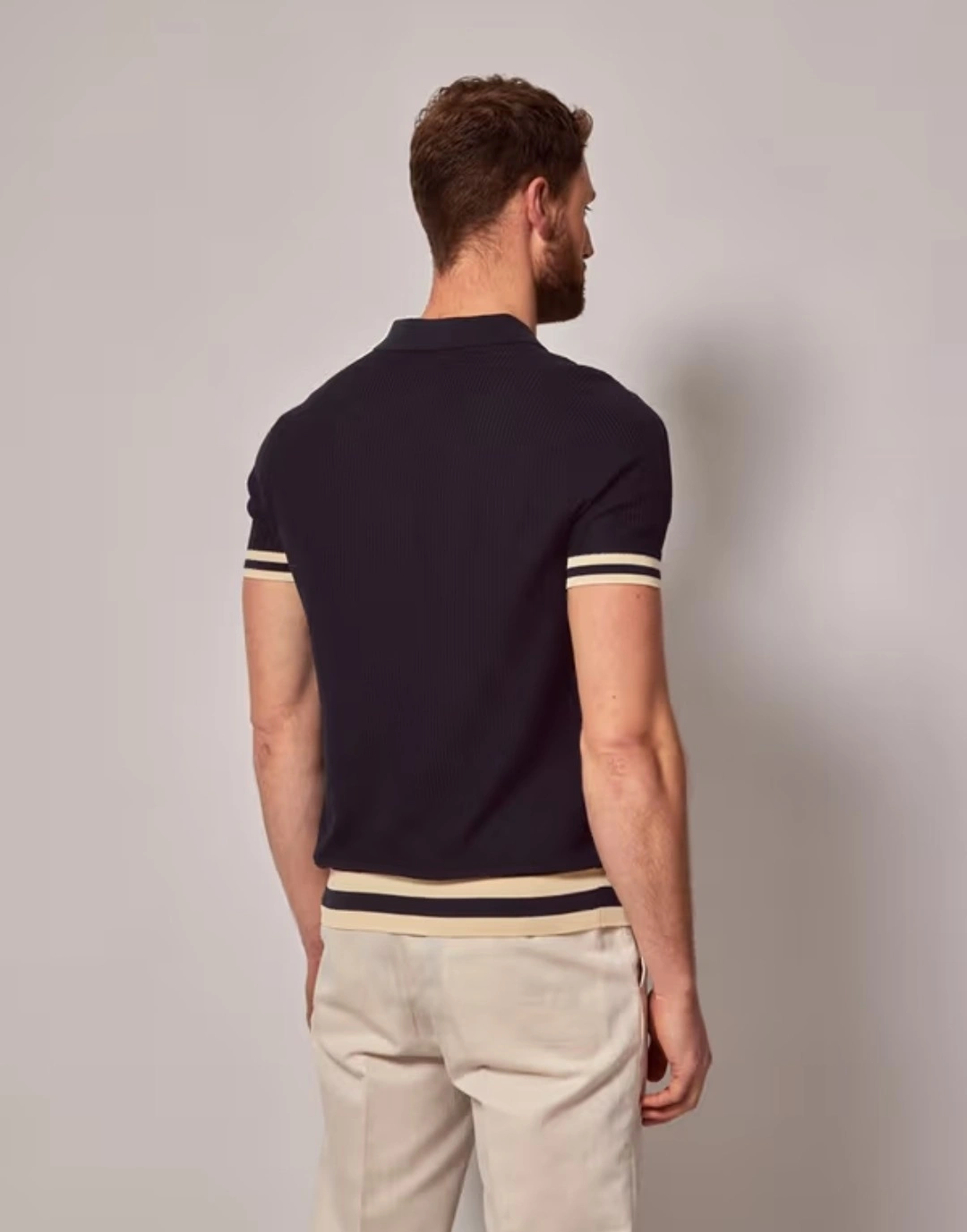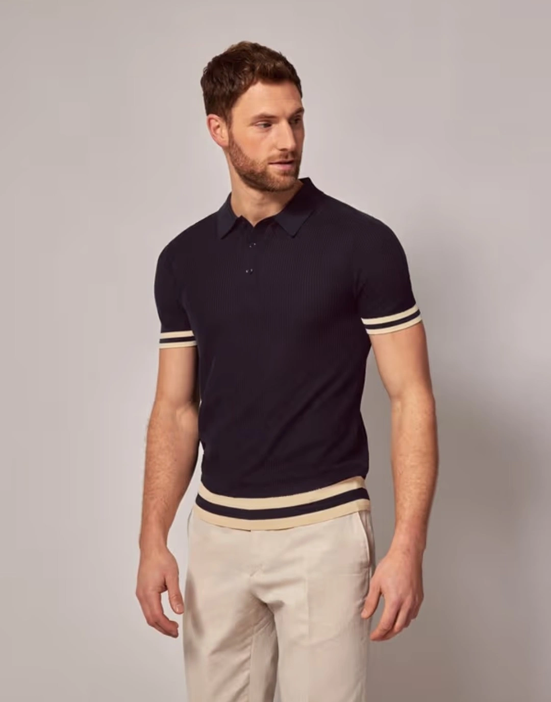 Hawes&Curtis Navy Tipped Textured Rib Knitted Cotton Polo Shirt