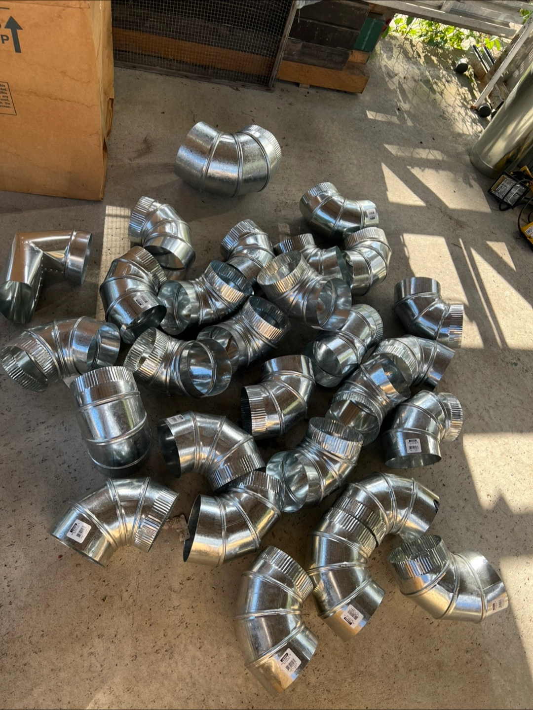 Many 6 inch galvanized steel elbows. Made in Canada. Ideal for HVAC or other ventilation projects.