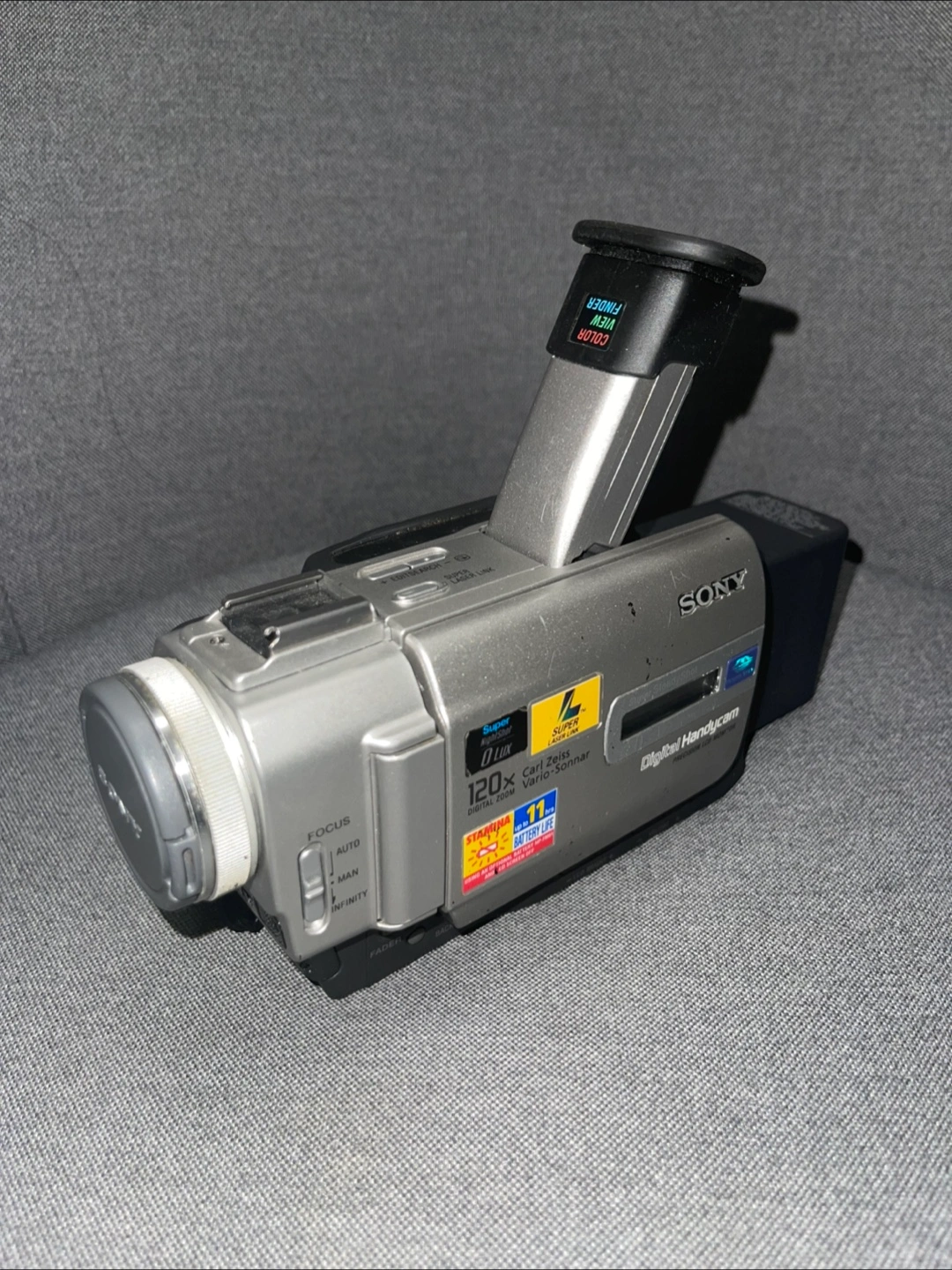 Vintage Sony Handycam. Features Carl Zeiss Vario-Sonnar lens. Digital video camera. Includes screen and hand strap. ***Surprisingly it still works quite nicely. Battery and charger included. Model: DCR-TRV11 Digital Zoom: 120x Optical Zoom: 10x Recording Media Type: Memory Stick Card (not included). Display Size: 3.5" Cosmetic Condition: Good/Fair (minimal surface wear/scratches. Small cover on the front missing for the flash. Other than that good. Kept in very good condition over the years. Tested and good to go. Pick up Dundas and Spadina.