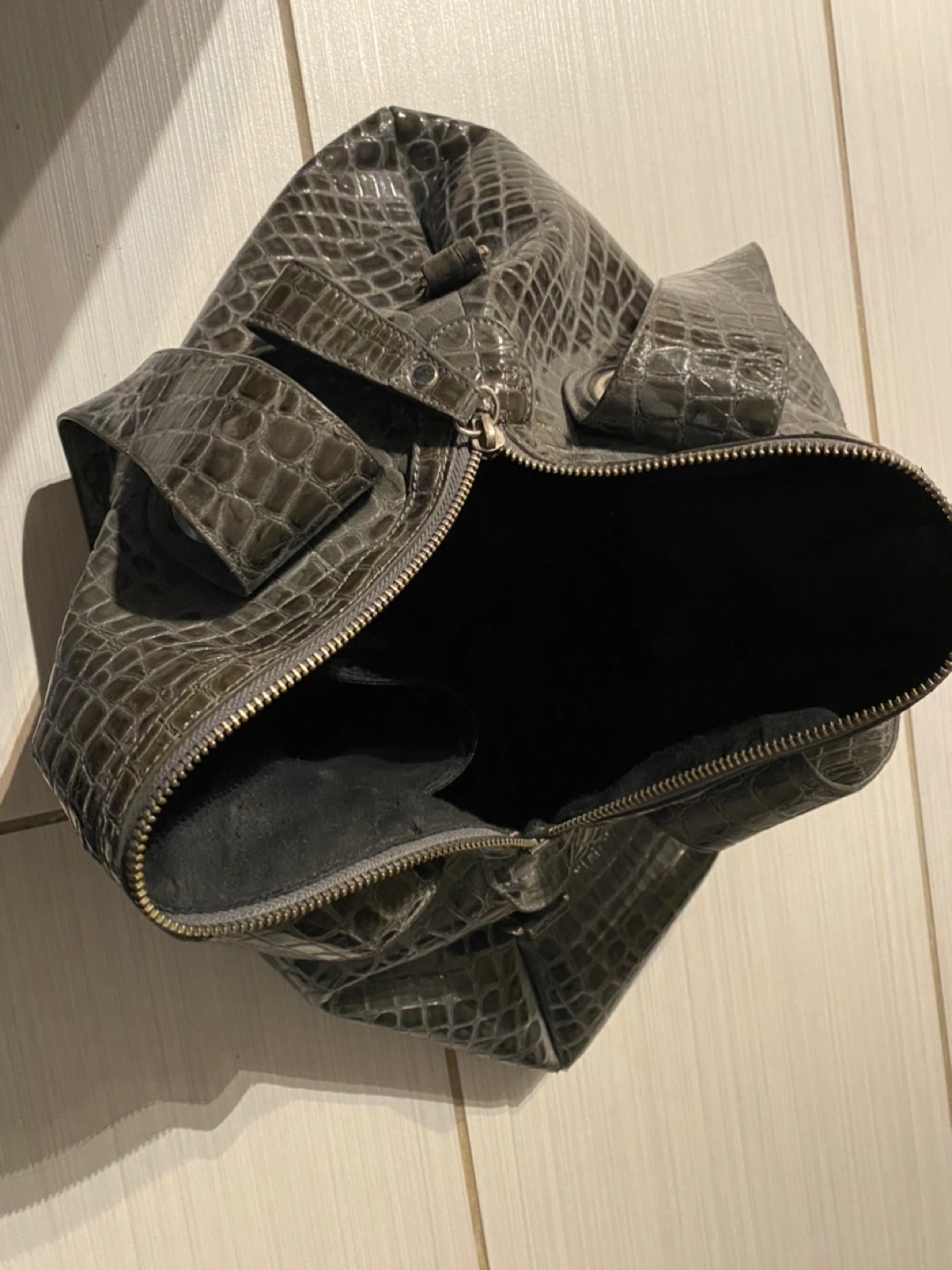 Dark grey crocodile-embossed leather handbag. Zip closure. Exterior pocket. Interior lining. Two handles. Great for everyday use.