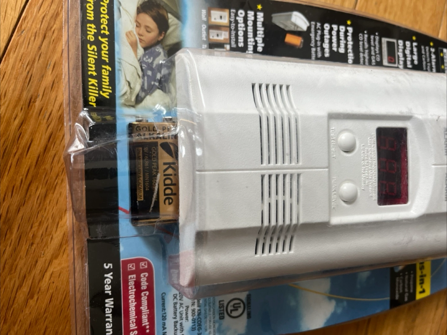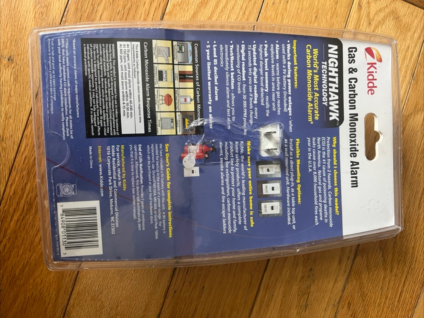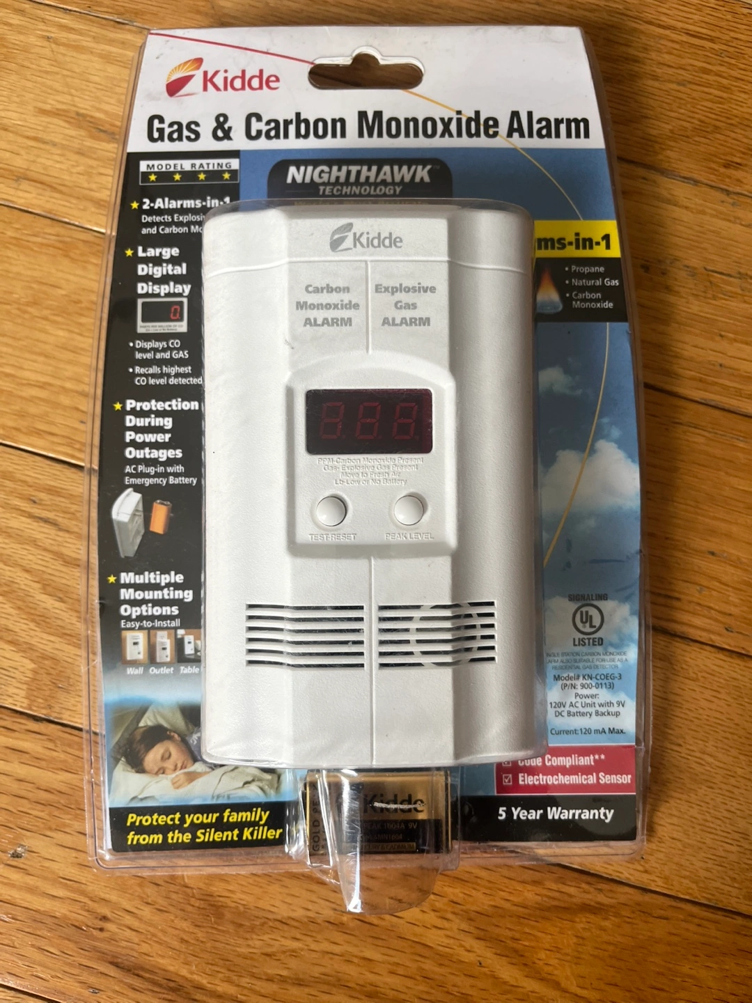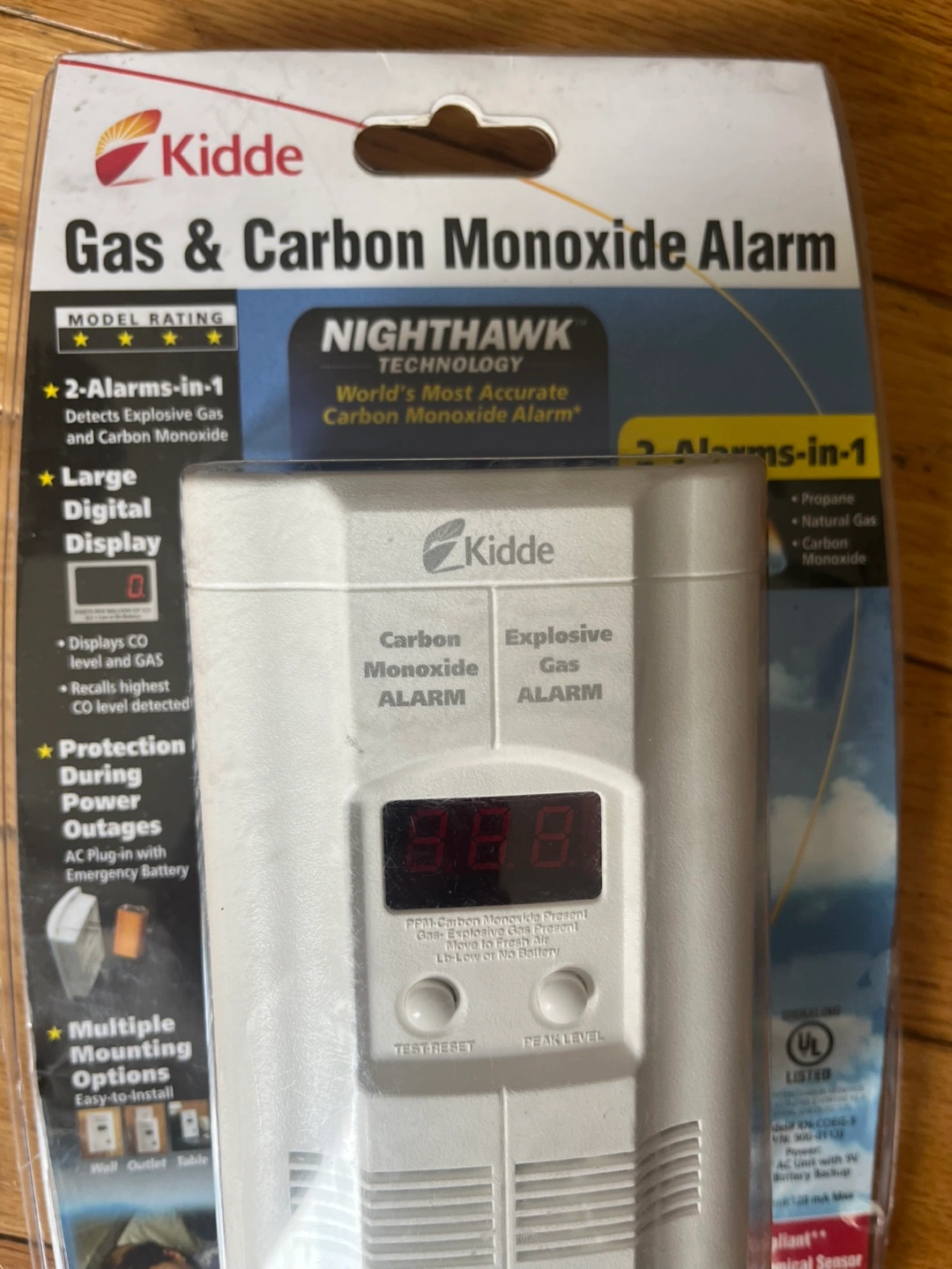 10New Kidde Nighthawk gas and carbon monoxide alarm. Detects explosive gas and carbon monoxide. Features a large digital display, showing highest CO level detected. Includes 5-year warranty. Multiple mounting options: wall, outlet, or tabletop. Powered by AC plug with emergency battery backup.
