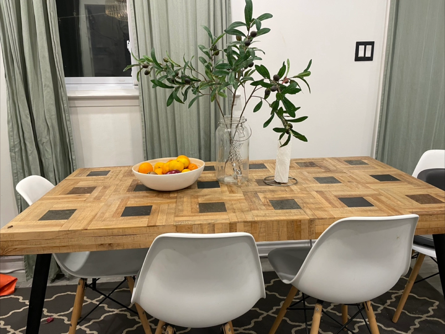 Solid wood dining table. Black metal legs. Unique parquet-style top. Seats six comfortably. Good condition.