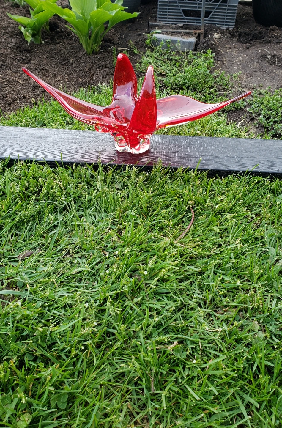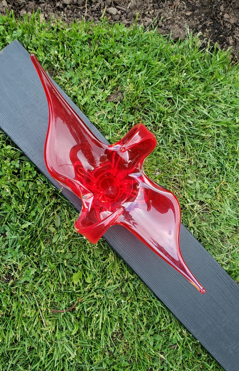 Stunning red glass art piece. Intricate design. Beautiful colours. Looks great on a shelf or mantle. Modern style. canadian made Chalet glass from the 70s.