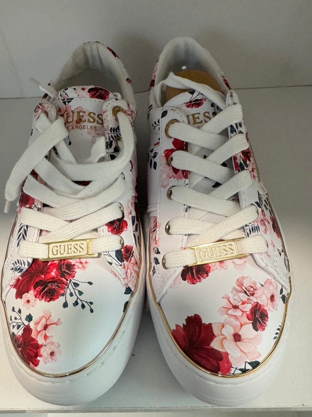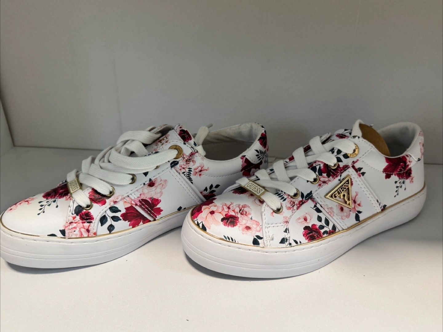 Brand new. Women's Guess sneakers. White base with a floral print. Gold accents. Lace-up closure. Platform sole.