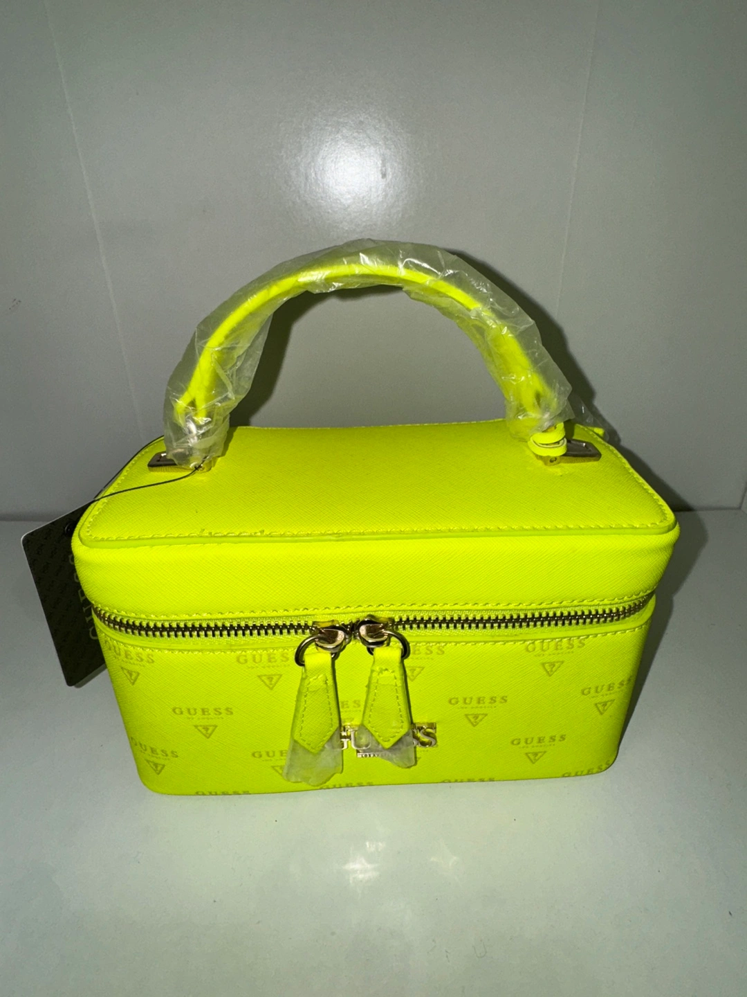 Bright yellow Guess handbag. Features a top handle and zip closure. All over logo print. Compact size, perfect for everyday use.