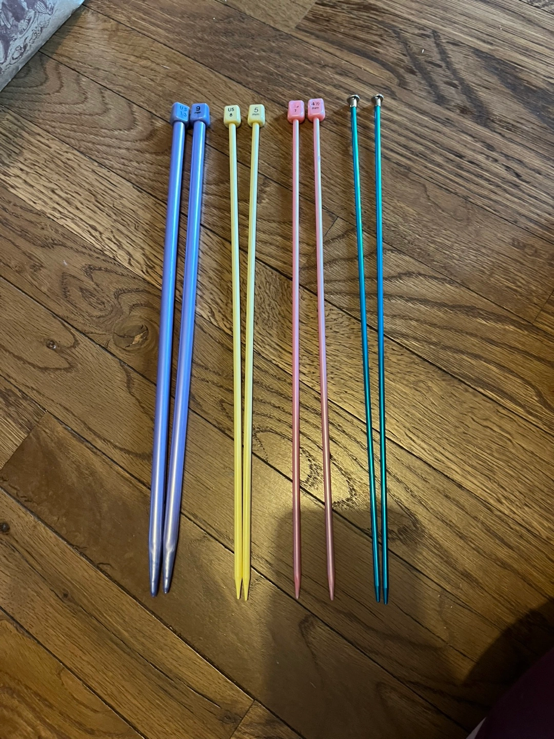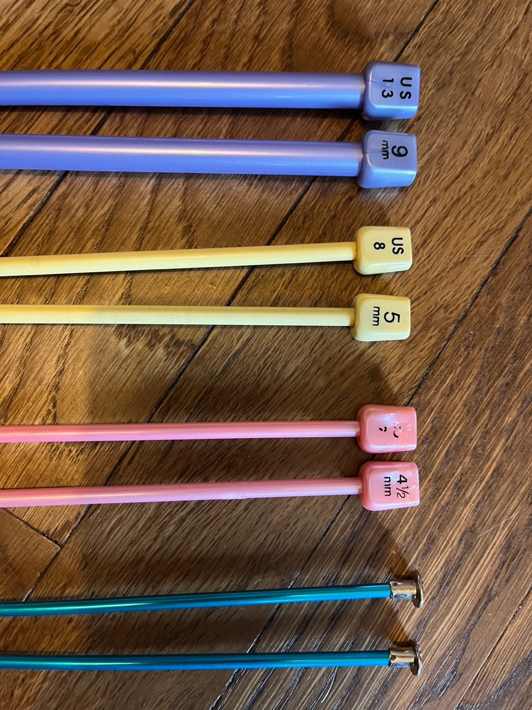 147Four pairs of knitting needles. Different sizes and colors. Includes US sizes 13, 8, 7 and 4 (9, 5, 4.5 and 3.5 mm). Plastic and metal needles.