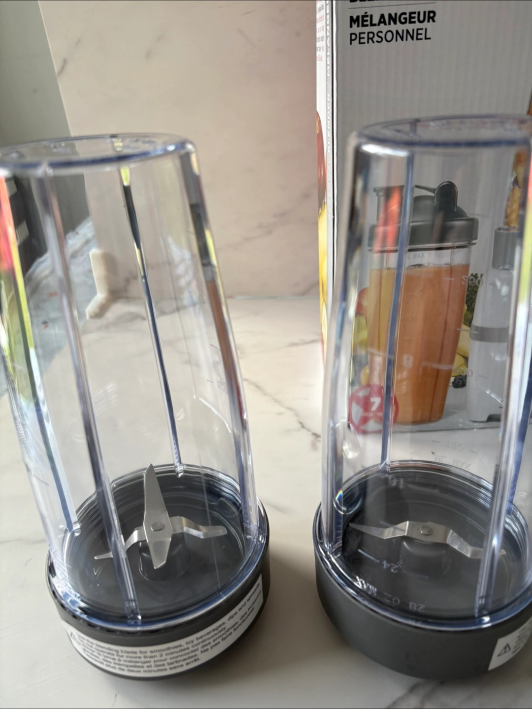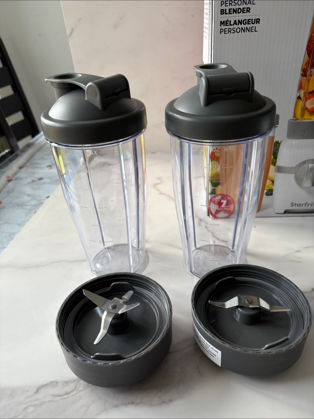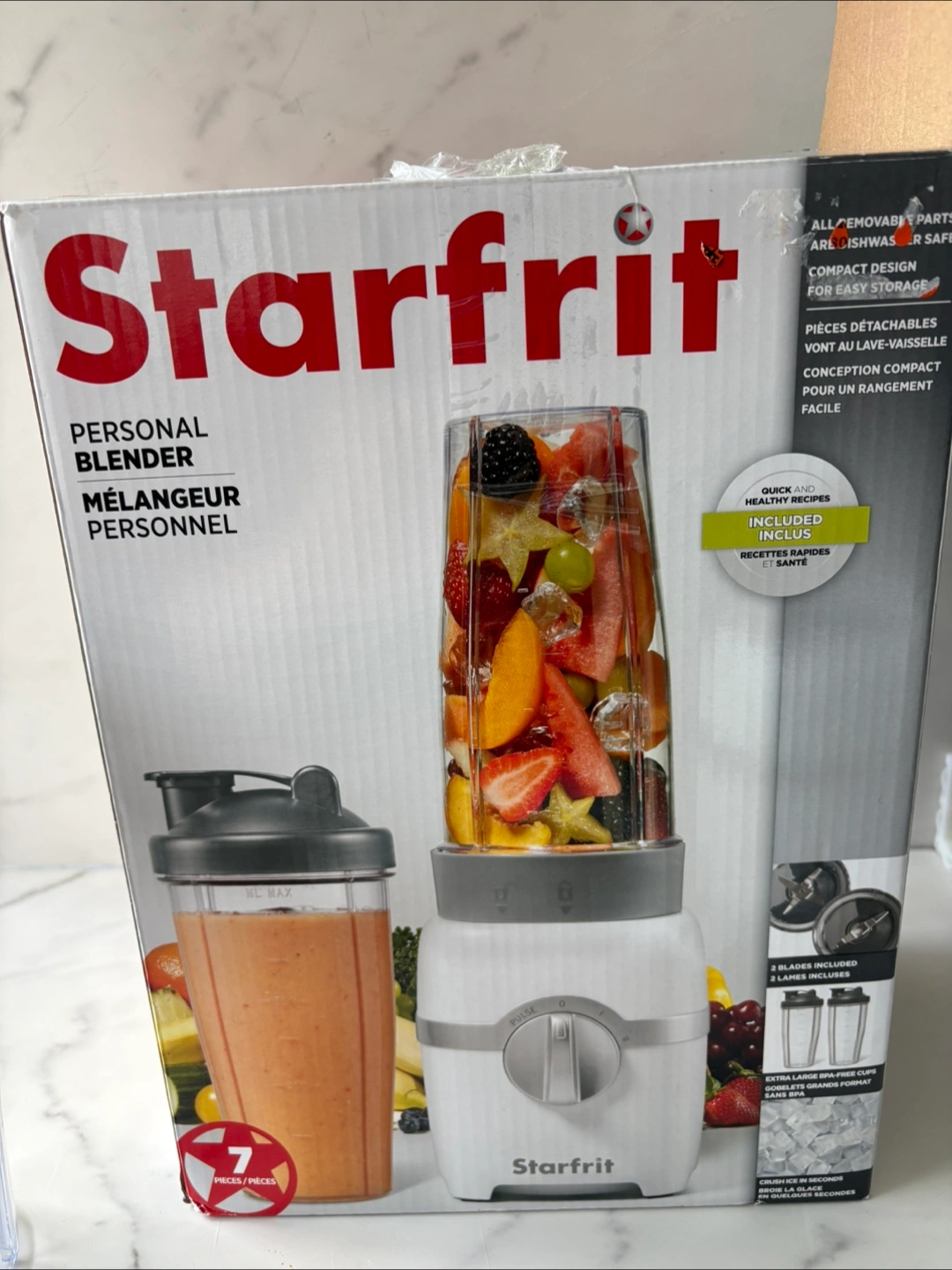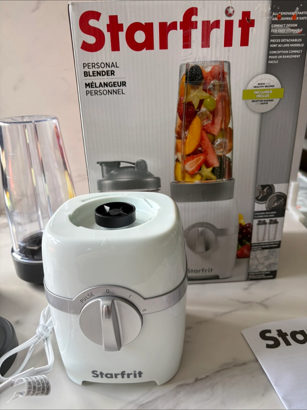 Description: Brand new Starfrit Personal Blender set – never used, still in the original box. • Includes 7 pieces: 2 blending blades (cross & flat), 2 extra-large 28 oz (828 ml) cups, 2 lids, and the powerful motor base. • 300-watt motor delivers strong blending power – easily crushes ice and blends fruits, veggies, and more. • Each smoothie cup holds up to 28 oz – perfect for large servings. • Ideal for smoothies, shakes, protein drinks, and more. • Compact and space-saving design. • All removable parts are dishwasher safe. • Comes with the original box and user manual. Price is final, no negotiations. Item is exactly as shown in the pictures