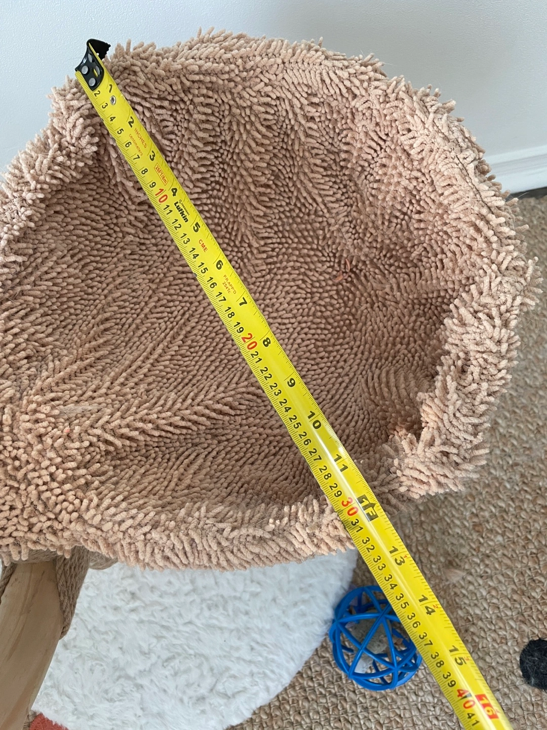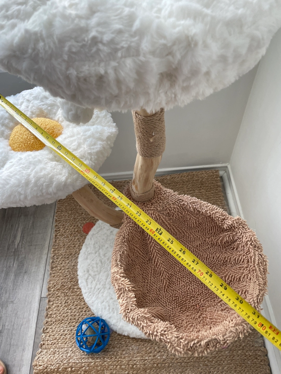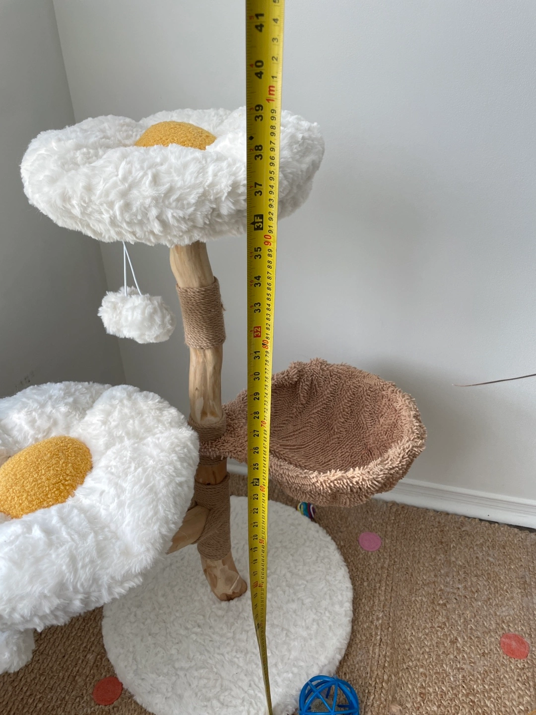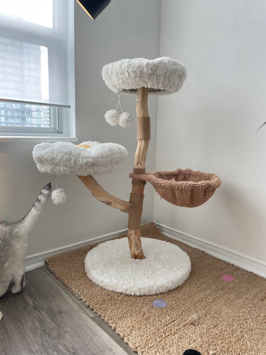 Unique cat tree, handmade. Features two fluffy daisy-shaped platforms and a cozy bowl-shaped bed. Natural wood post with jute rope. Perfect for playful cats. Includes hanging pom-poms.