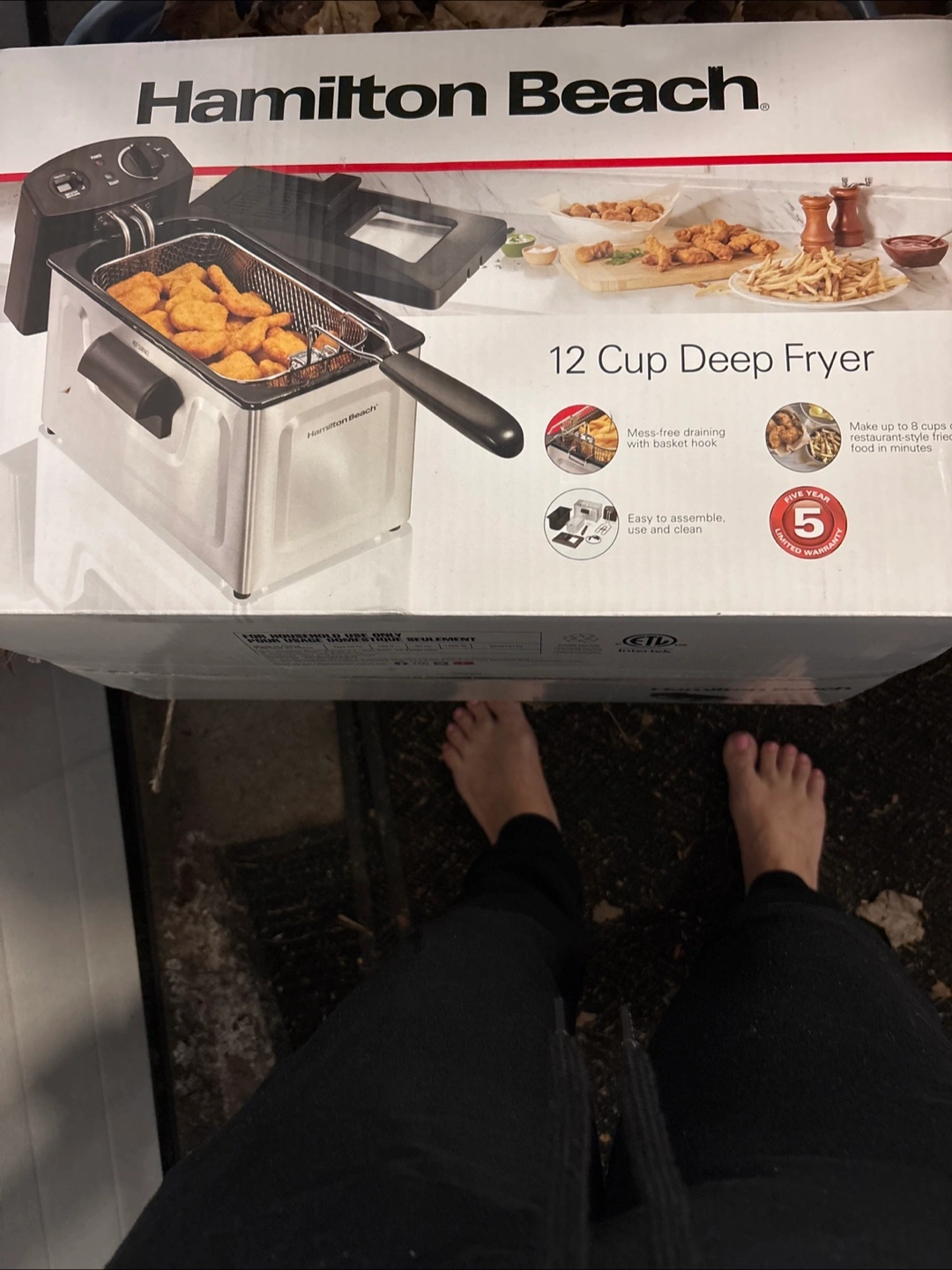 Brand new, unopened Hamilton Beach 12 cup deep fryer. Easy to assemble, use and clean. Features mass-free draining with a removable basket. Digital timer with audible tone. Magnetic cord for easy detaching.