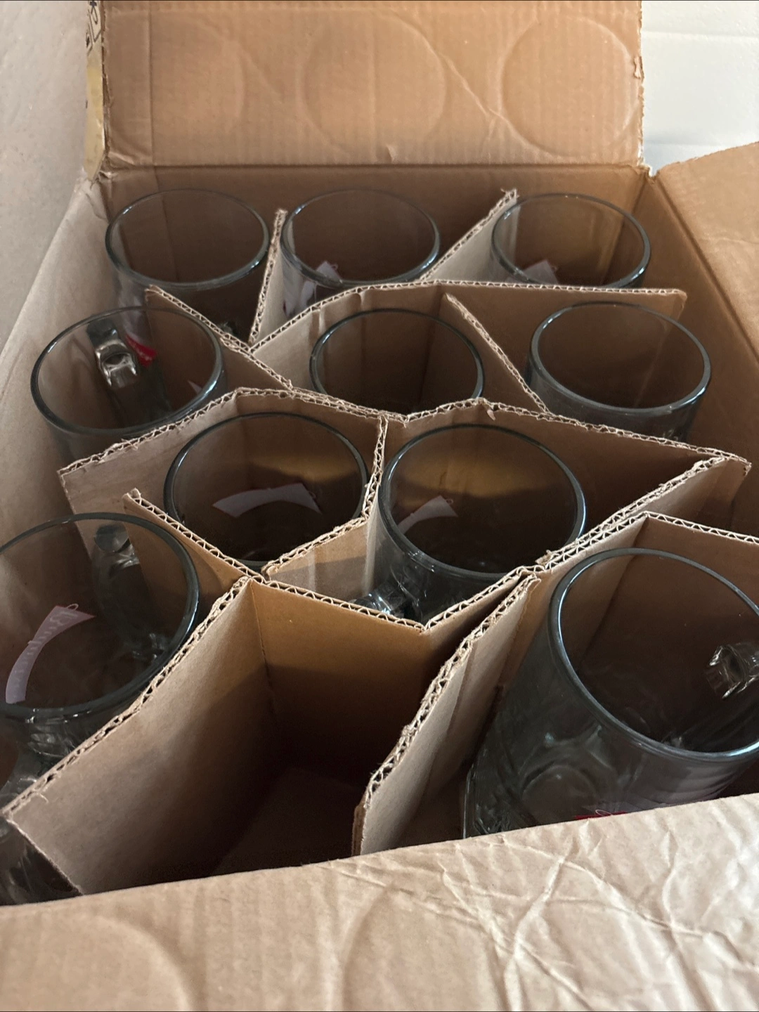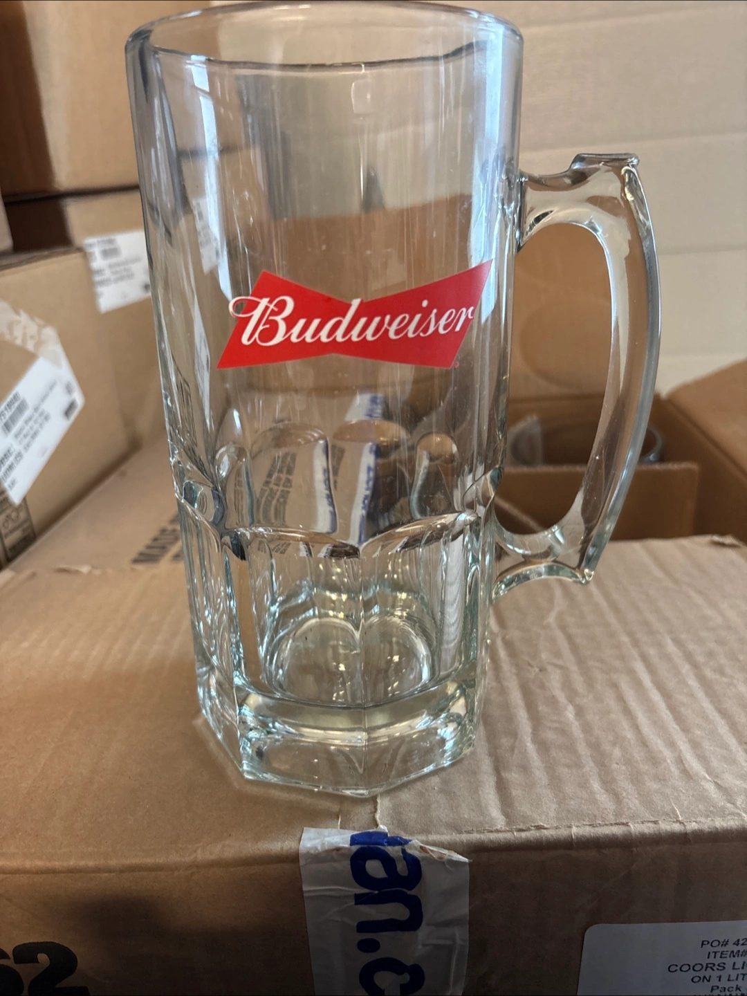 REDUCED $7 Liscensed budweiser 1 l beer stein /mug $8 each or all 10 for $60 Set of twelve clear glass Budweiser beer steins. Perfect for parties or home use.