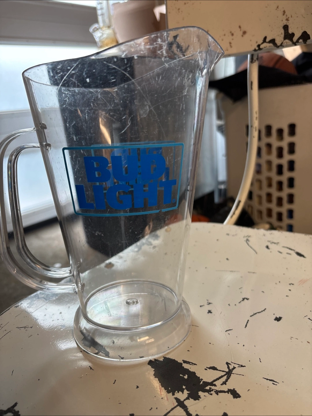 12 Clear plastic beverage pitcher. Features Bud Light logo. Shows some wear plastic scratches but all in great usable condition
