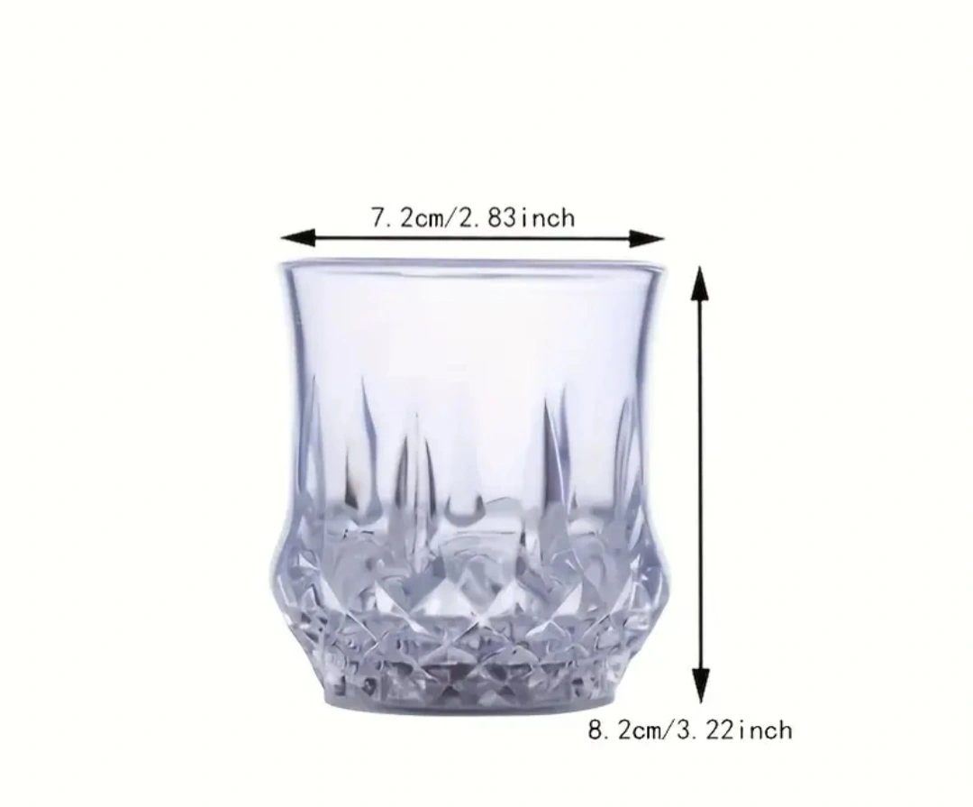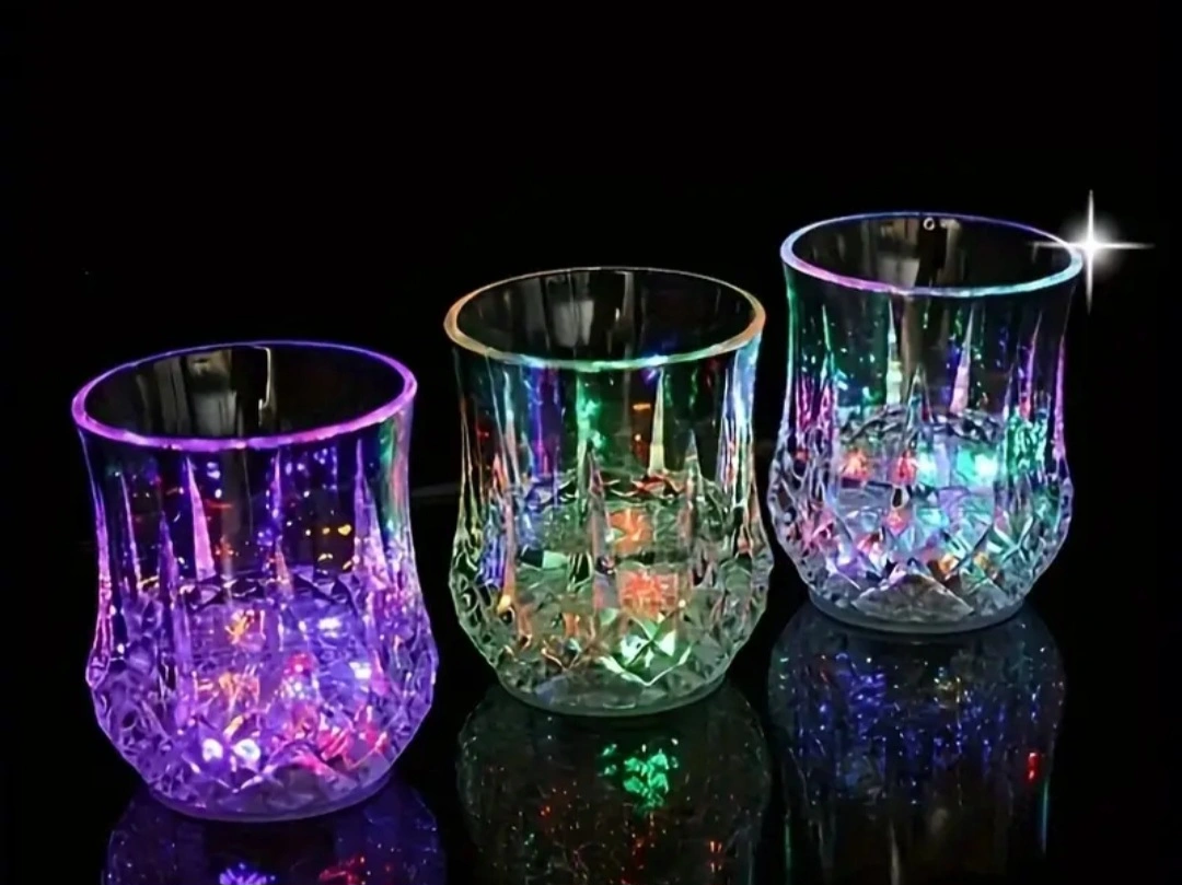 Colour changing LED glasses. Perfect for parties and events. Battery operated. Set of four cups included. Approximately 7.2cm diameter and 8.2cm tall.