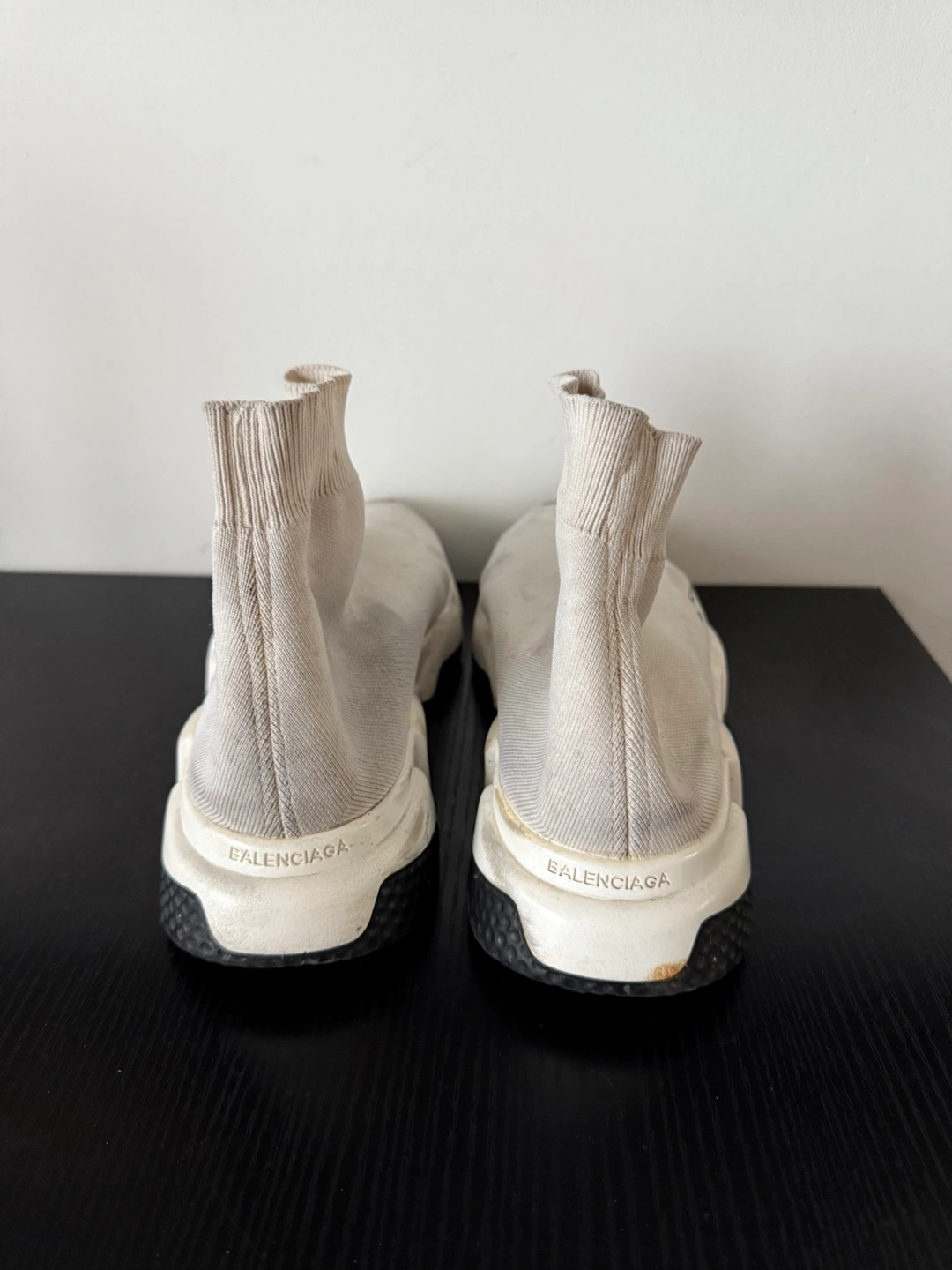 Pre-owned Balenciaga Speed Trainers. Off-white colour. Some visible wear and staining. Sock-like design. Chunky sole. Comfortable and stylish. Size 9us