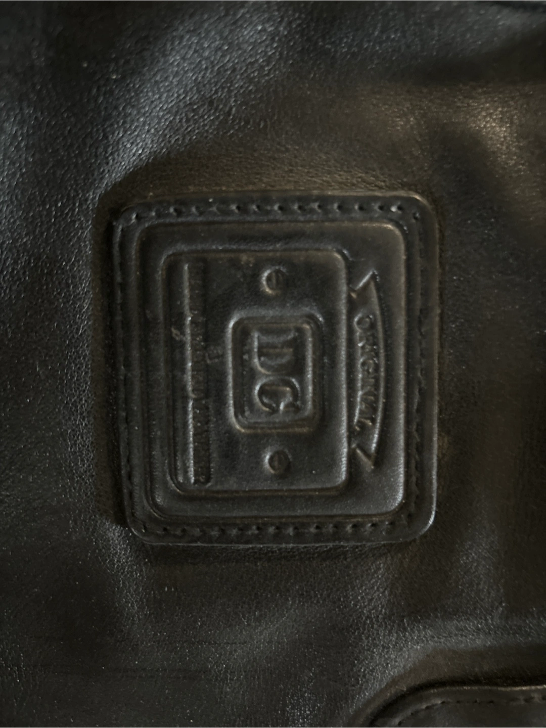 Black leather satchel. Features two top handles, a detachable shoulder strap, and zipper closure. Interior includes multiple compartments. Suitable for travel or business.