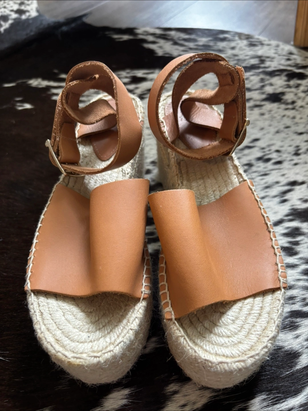 Cognac-Tan Leather Espadrille Platform Sandals 6-6.5