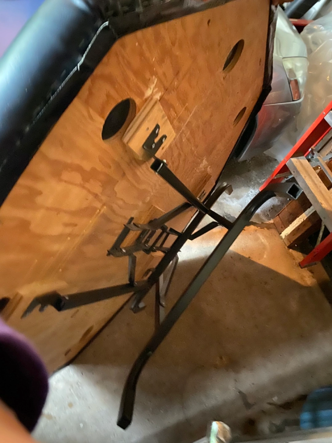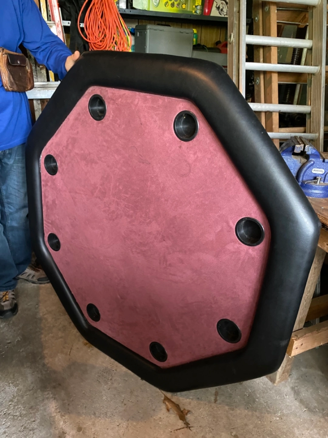 Used octagon-shaped poker table top. Burgundy felt surface. Black vinyl edges. Metal folding legs. Custom made! Good condition. Great for games! Table is currently stores in Etobicoke, pick-up will have to be there.