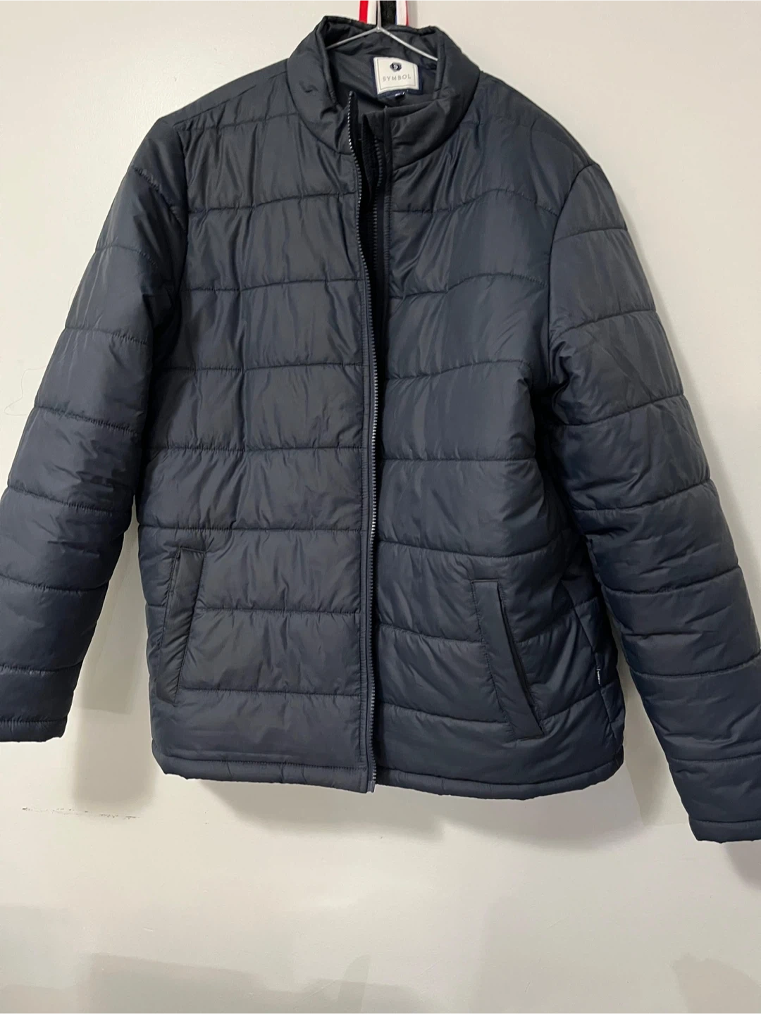 Navy blue puffer jacket. Zip-up front. Long sleeves. Size XL.