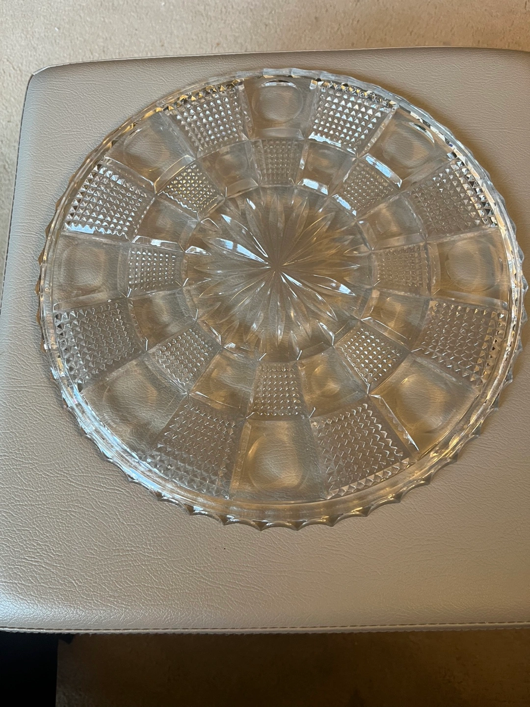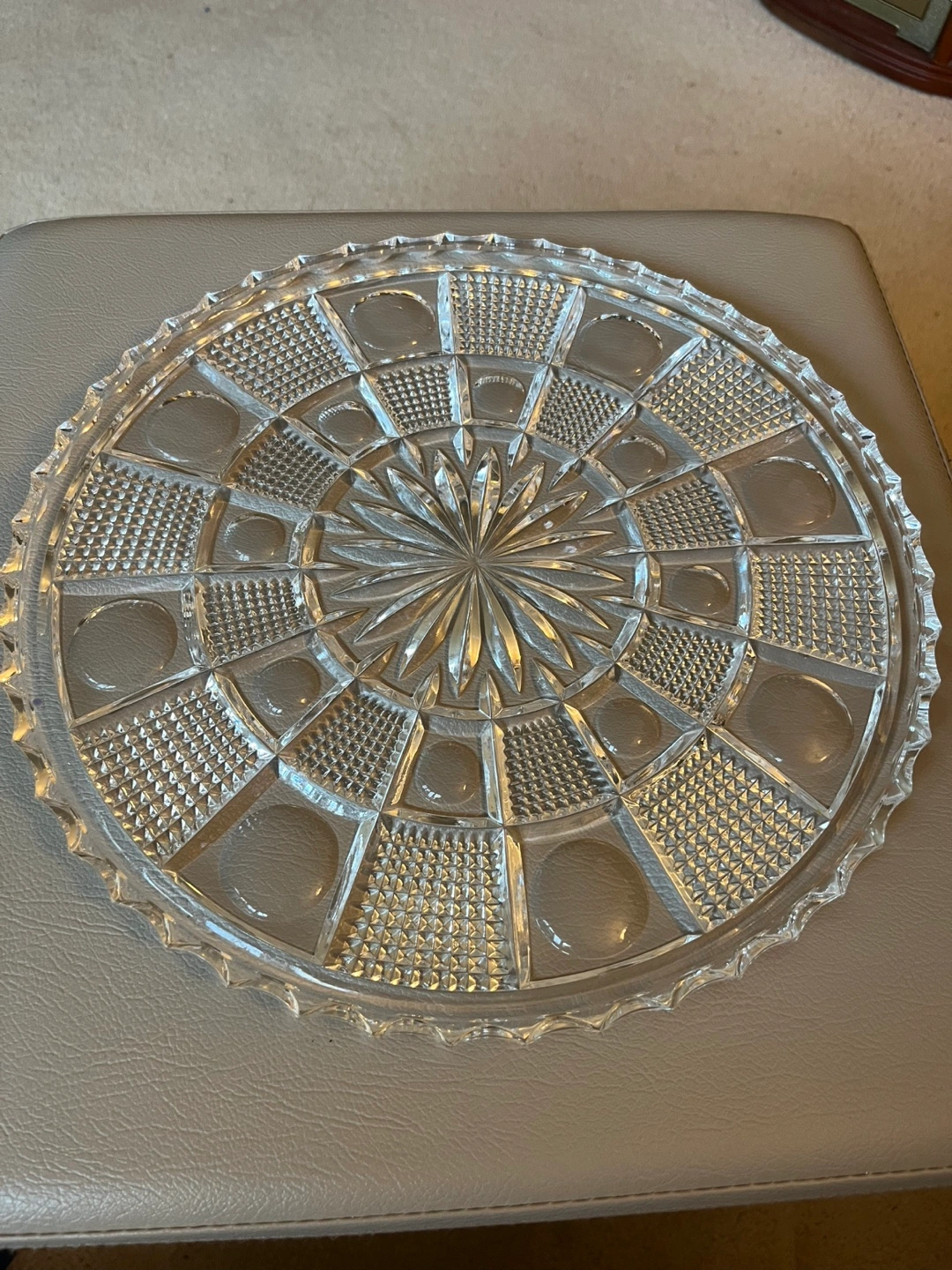 1000+Large, round crystal serving platter. Intricate cut glass design. Perfect for cakes, cookies, or other treats, or for use as a nice jewellery tray for a dresser. Adds elegance to any table. Available for pickup in Markland Wood.