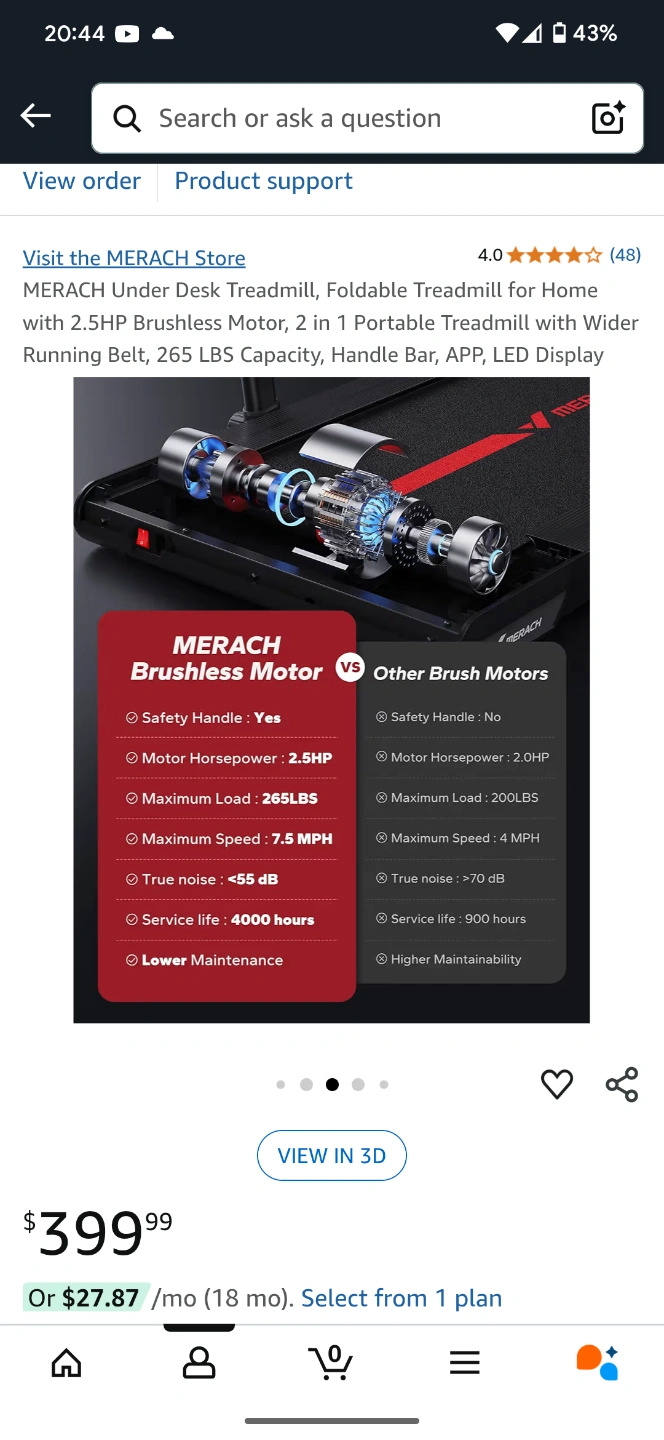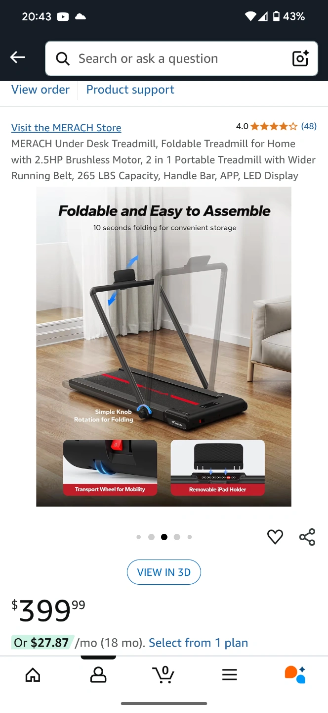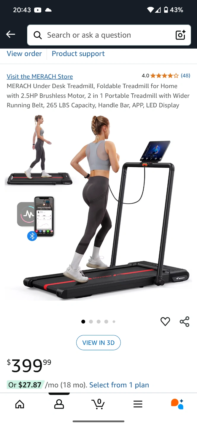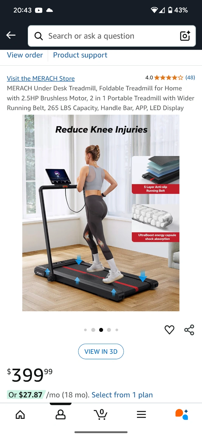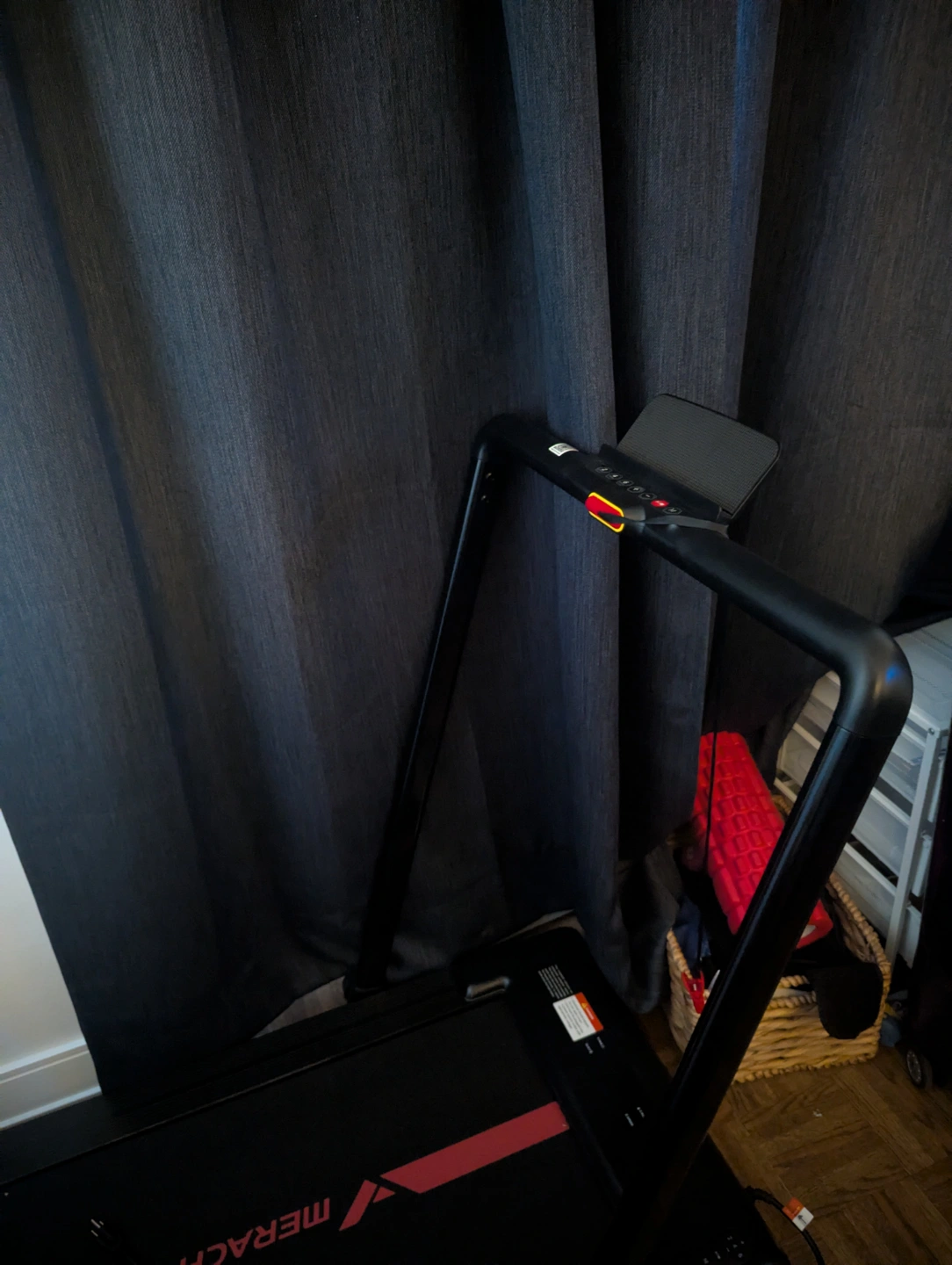 Under desk treadmill. Foldable design, easy to store. 2.5HP brushless motor. Wider running belt. 265 LBS capacity. Handle bar, app, and LED display included. Excellent home workout equipment.