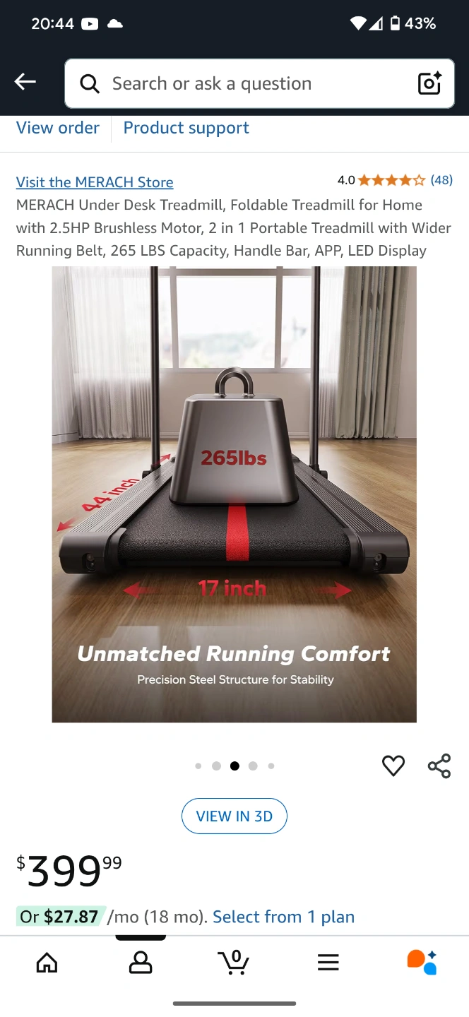 Under desk treadmill. Foldable design, easy to store. 2.5HP brushless motor. Wider running belt. 265 LBS capacity. Handle bar, app, and LED display included. Excellent home workout equipment.