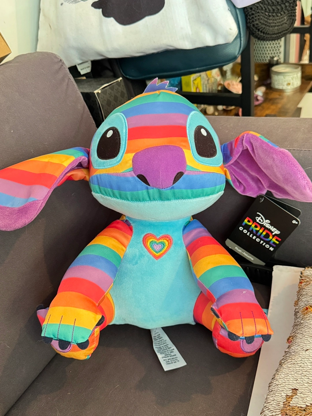 67Adorable Stitch plush toy. Features rainbow colours. Part of Disney's Pride collection. Soft and cuddly.